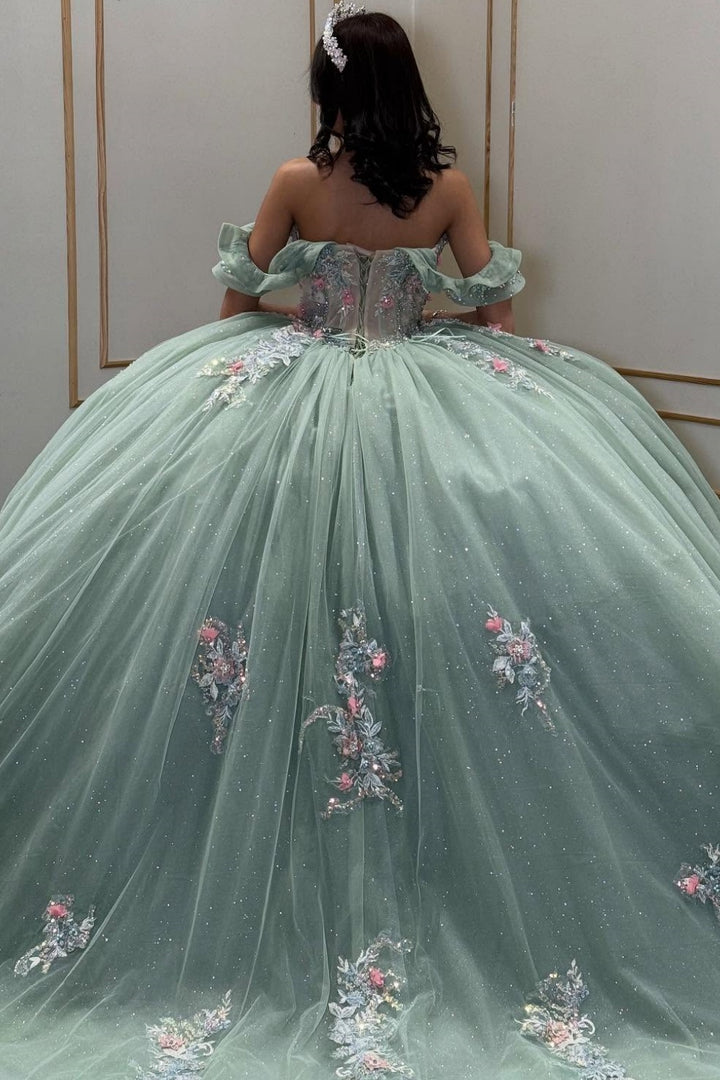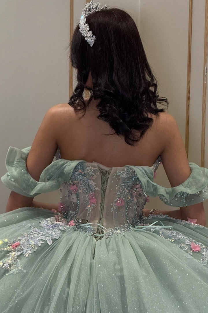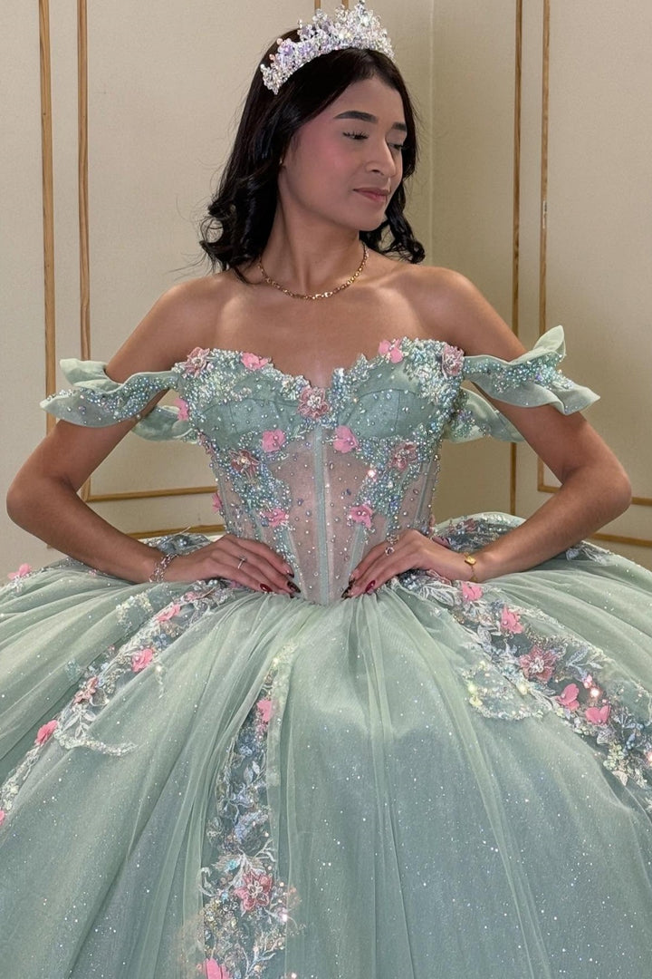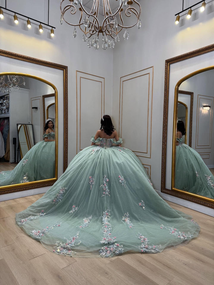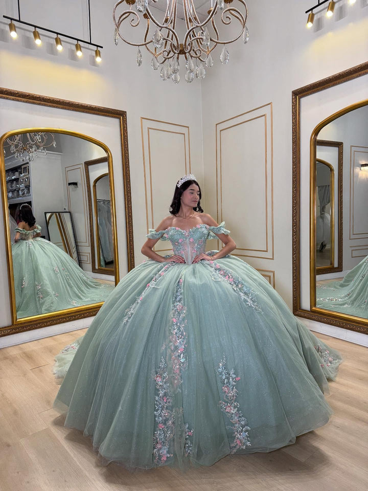 Description: This off-shoulder, sleeveless quinceañera dress in refreshing mint green features intricate beadwork and exquisite 3D flower appliques, creating a delicate yet striking visual effect. Designed to flatter the shoulders and neckline, it combines elegance with contemporary charm, making it a perfect choice for a memorable Sweet 15 celebration. Crafted to ensure comfort and style, this dress elevates your special day with refined sophistication.