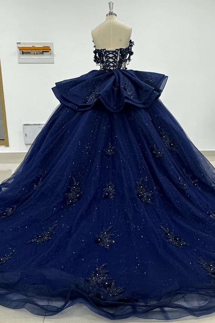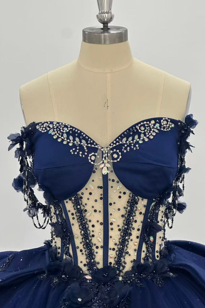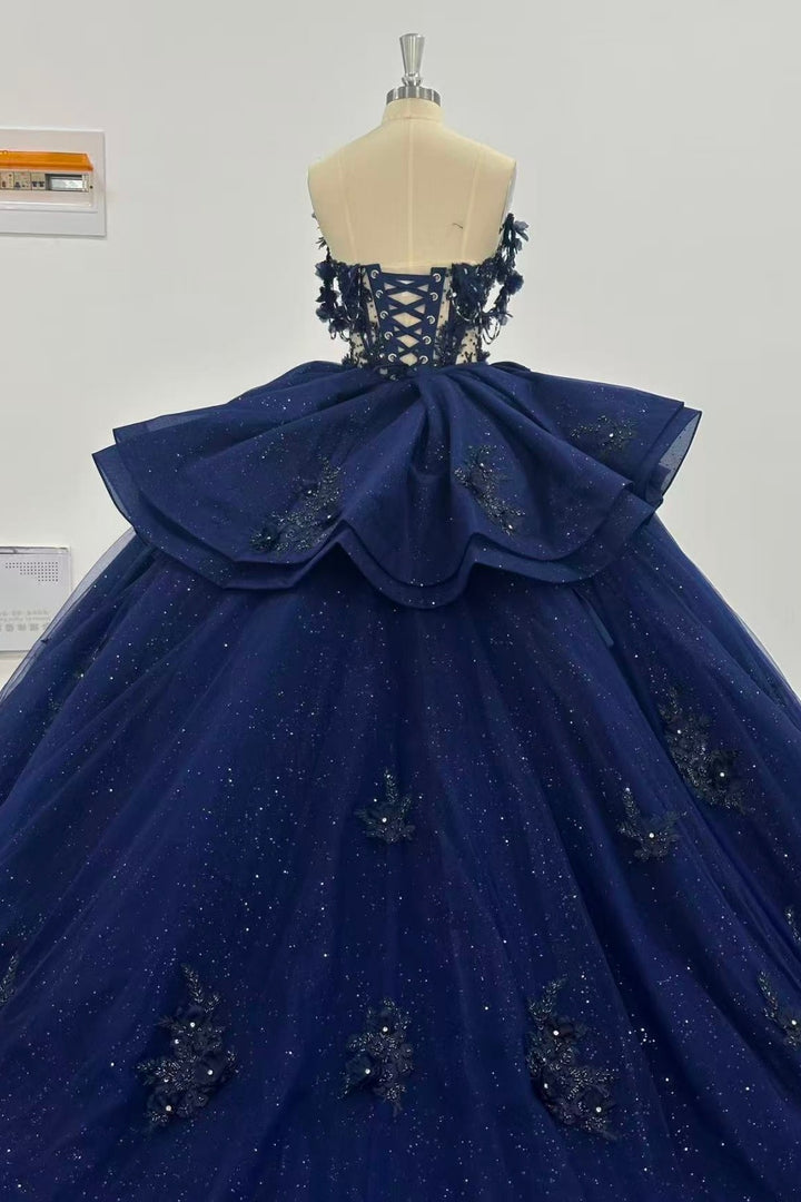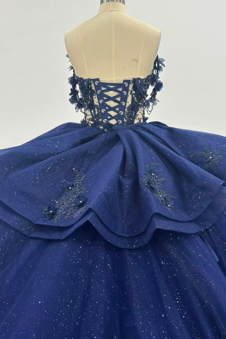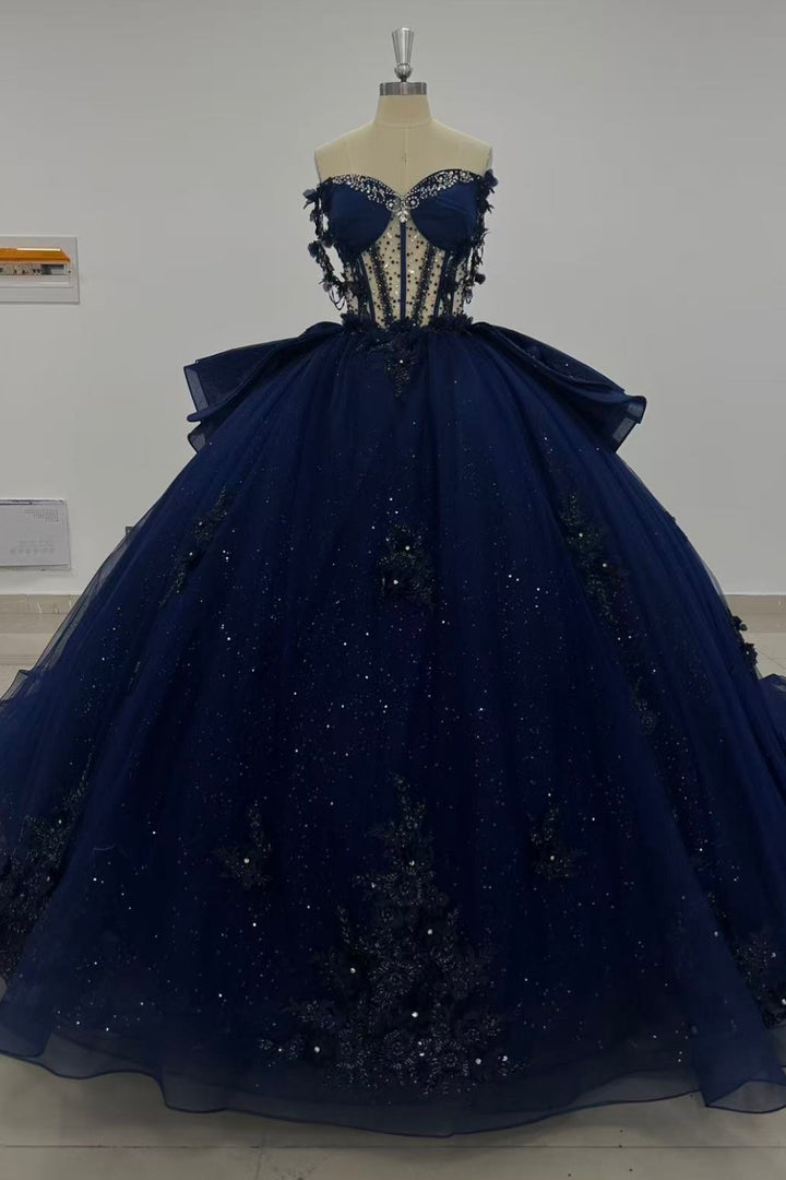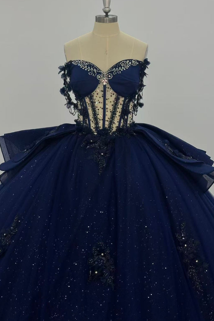 Langes Quinceanera-Kleid mit Herzausschnitt für Damen, trägerloses Korsett mit Blumenapplikationen, Perlenbesetztes Tüll-Ballkleid