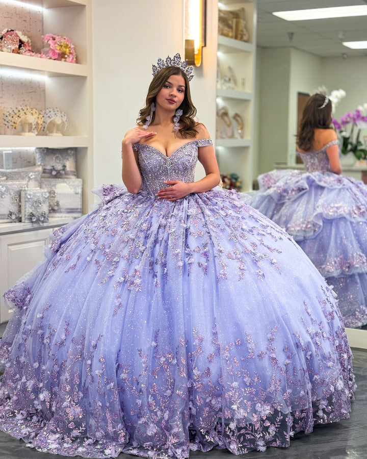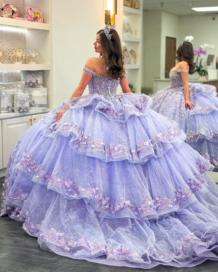 • Merkmale des Quinceanera-Kleides: Langes Ballkleid mit Blumenapplikationen und trägerlosem Korsett, verziert mit metallischen Stickereien und Kristallperlen; der volle Glitzertüllrock wurde passend dazu akzentuiert und verfügt über eine geformte Überlage und eine Kathedralenschleppe.