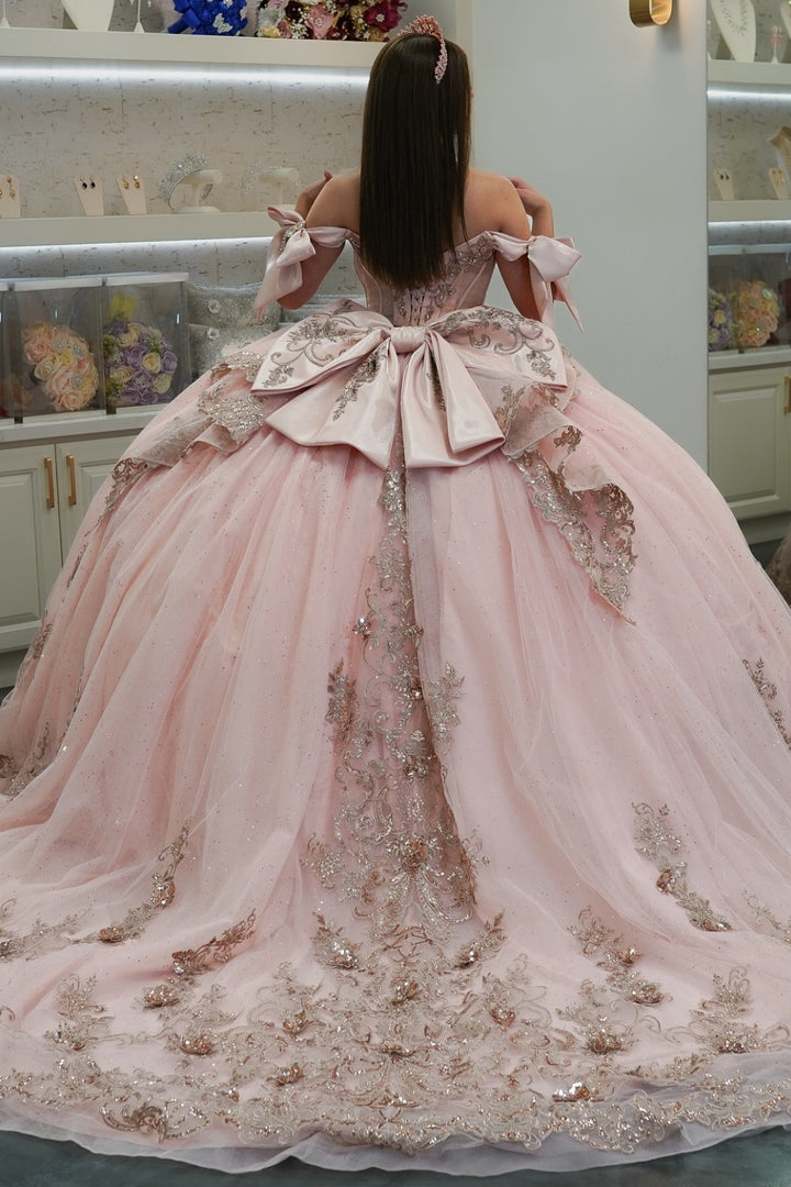 Langes Quinceanera-Kleid mit Herzausschnitt für Damen, trägerloses Korsett mit Blumenapplikationen, Perlenbesetztes Tüll-Ballkleid