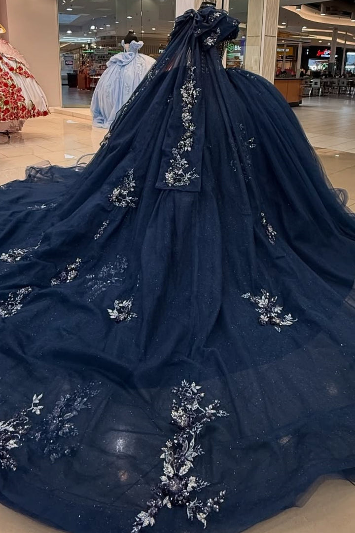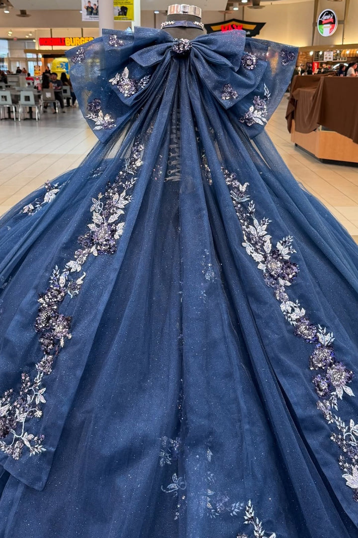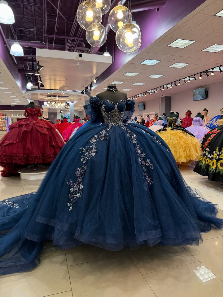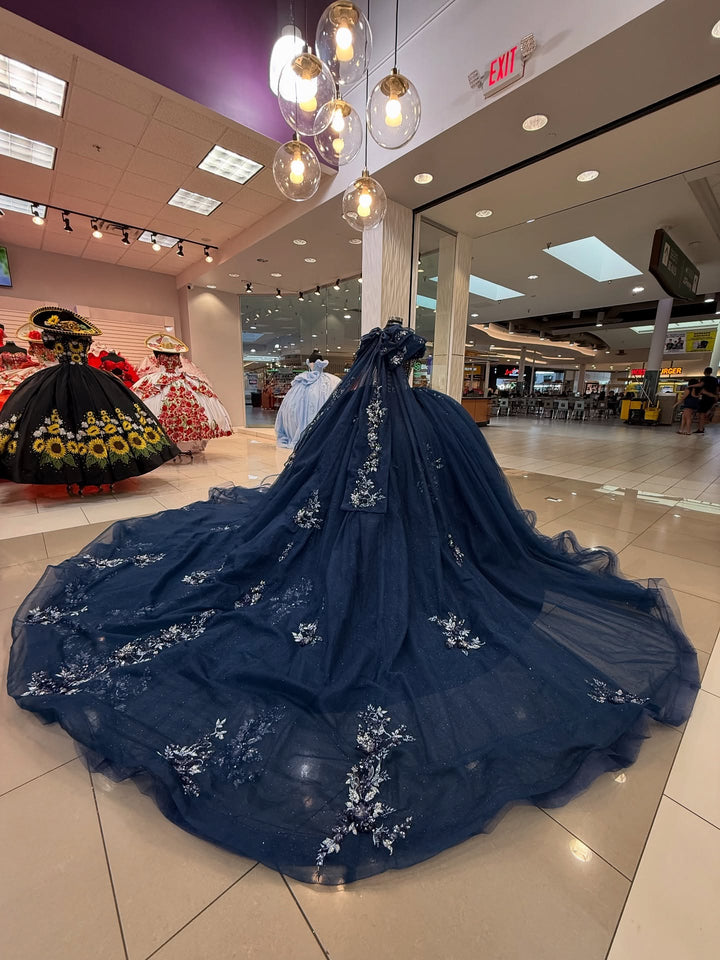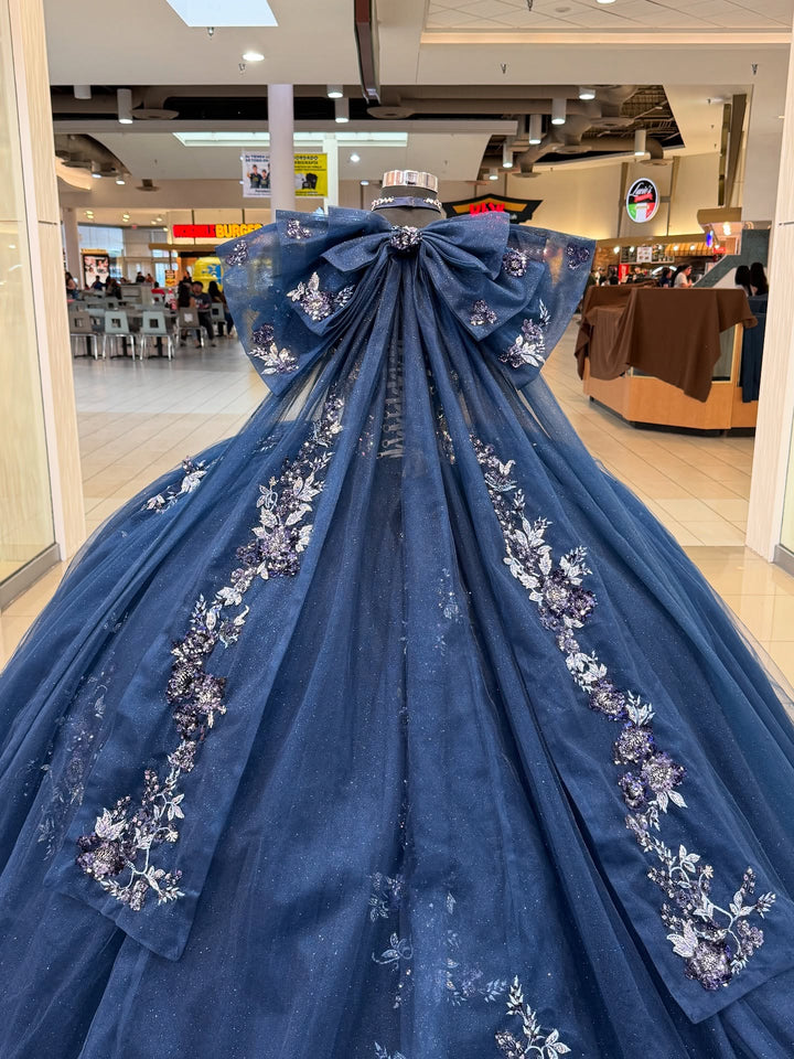 • Merkmale des Quinceanera-Kleides: Langes Ballkleid mit Blumenapplikationen und trägerlosem Korsett, verziert mit metallischen Stickereien und Kristallperlen; der volle Glitzertüllrock wurde passend dazu akzentuiert und verfügt über eine geformte Überlage und eine Kathedralenschleppe.