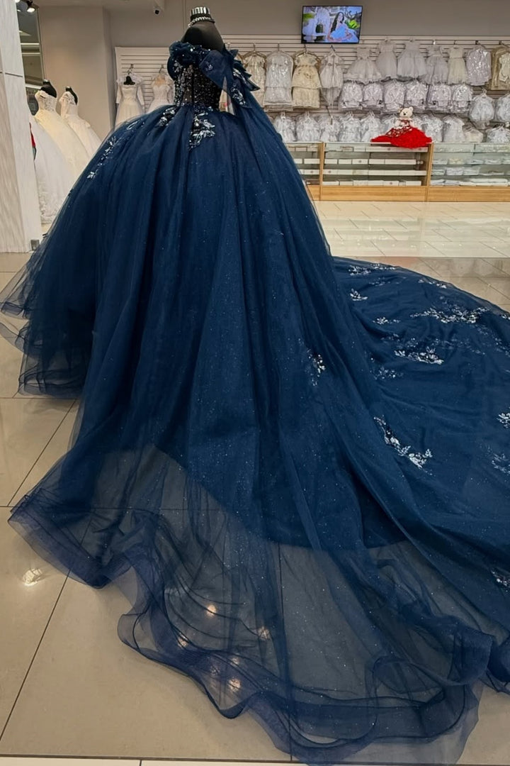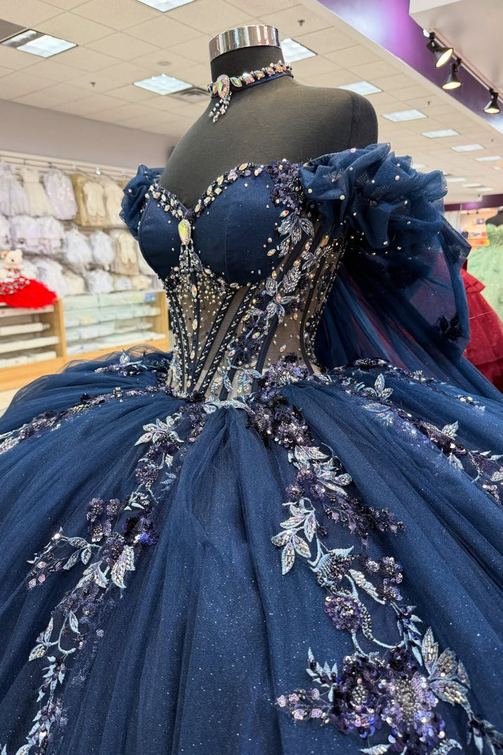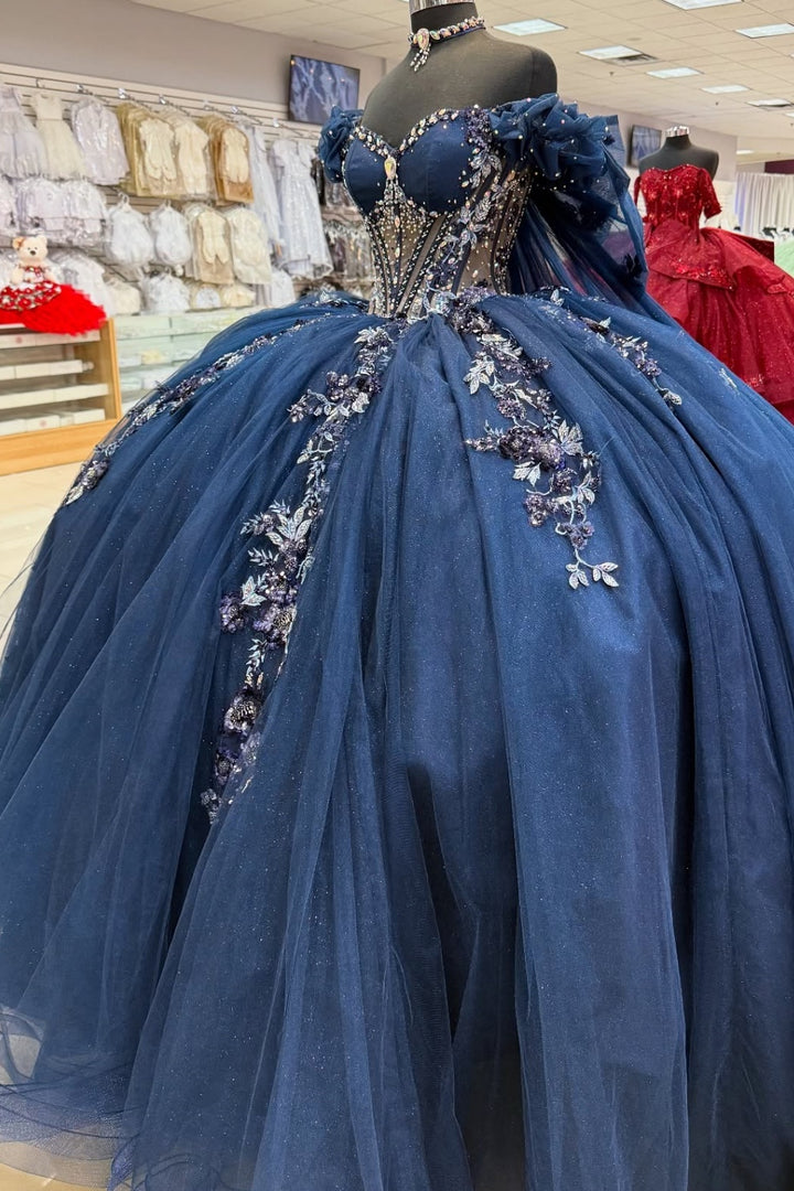Langes Quinceanera-Kleid mit Herzausschnitt für Damen, trägerloses Korsett mit Blumenapplikationen, Perlenbesetztes Tüll-Ballkleid