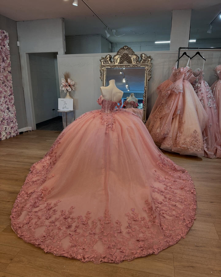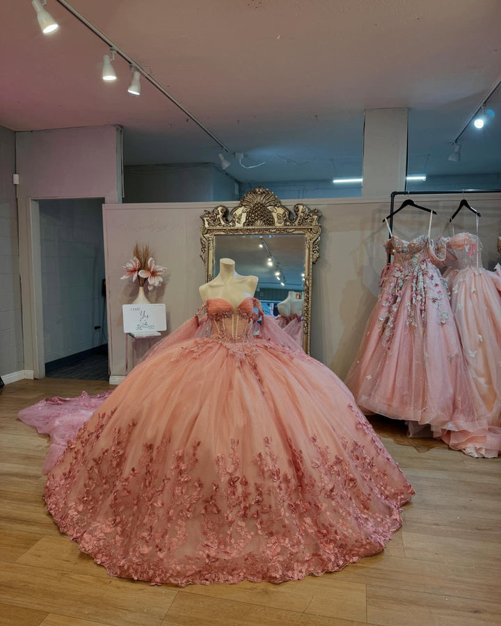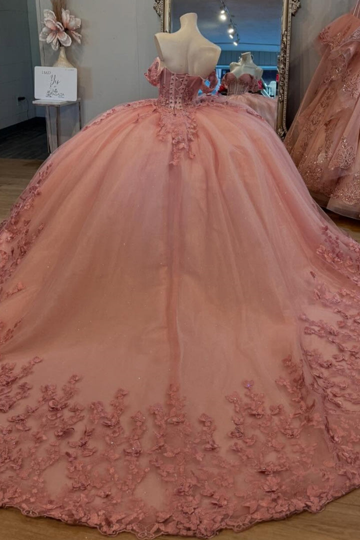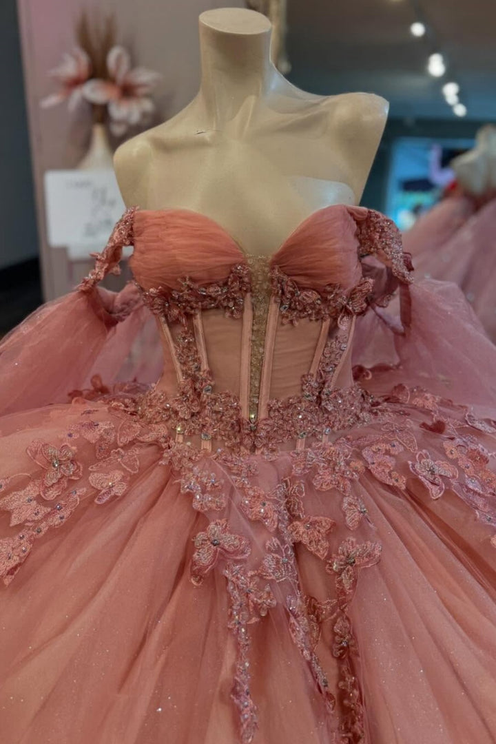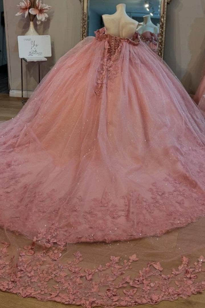 Langes Quinceanera-Kleid mit Herzausschnitt für Damen, trägerloses Korsett mit Blumenapplikationen, Perlenbesetztes Tüll-Ballkleid