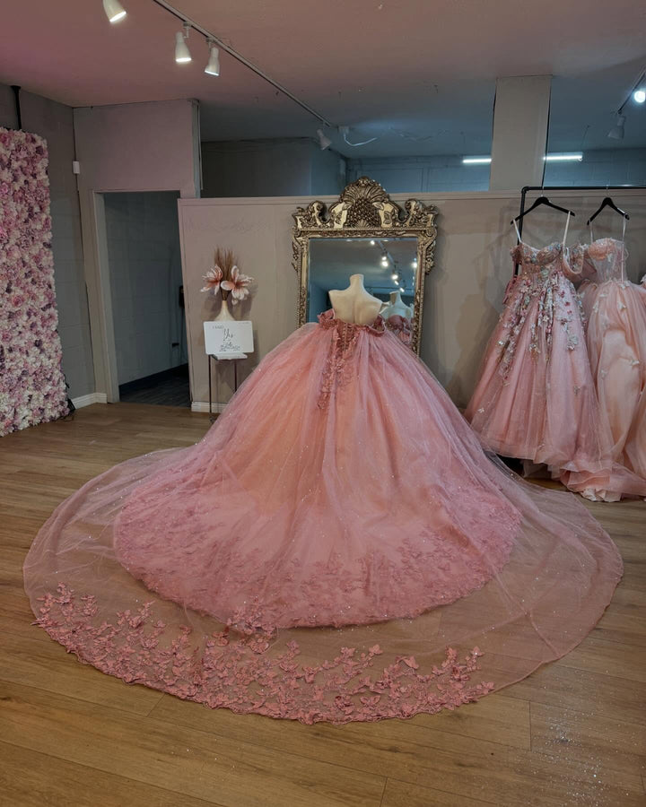 • Merkmale des Quinceanera-Kleides: Langes Ballkleid mit Blumenapplikationen und trägerlosem Korsett, verziert mit metallischen Stickereien und Kristallperlen; der volle Glitzertüllrock wurde passend dazu akzentuiert und verfügt über eine geformte Überlage und eine Kathedralenschleppe.