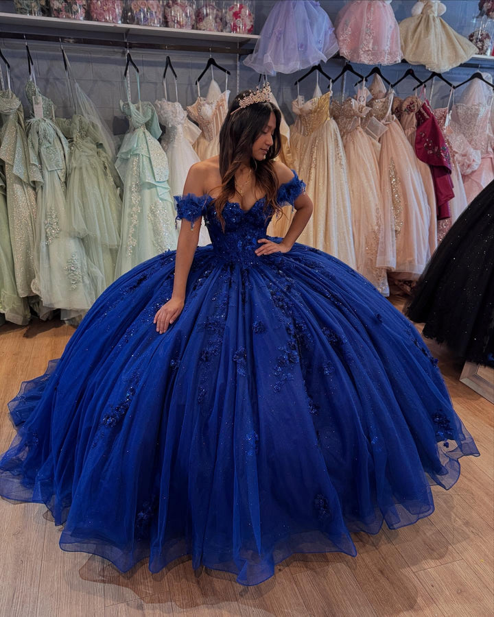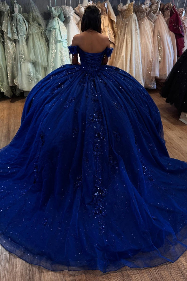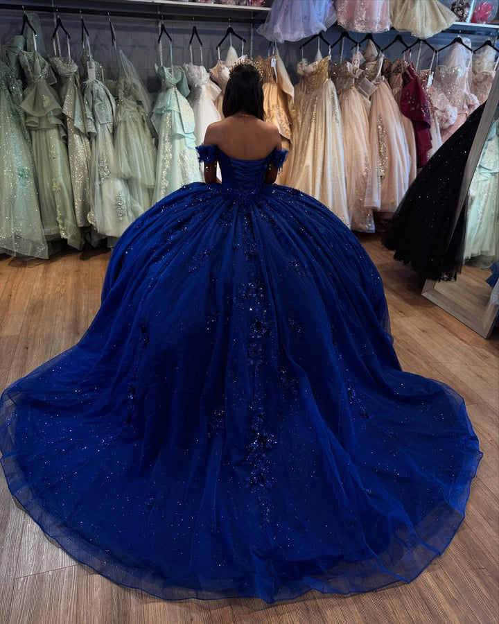 • Merkmale des Quinceanera-Kleides: Langes Ballkleid mit Blumenapplikationen und trägerlosem Korsett, verziert mit metallischen Stickereien und Kristallperlen; der volle Glitzertüllrock wurde passend dazu akzentuiert und verfügt über eine geformte Überlage und eine Kathedralenschleppe.