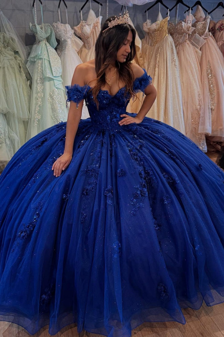 Langes Quinceanera-Kleid mit Herzausschnitt für Damen, trägerloses Korsett mit Blumenapplikationen, Perlenbesetztes Tüll-Ballkleid