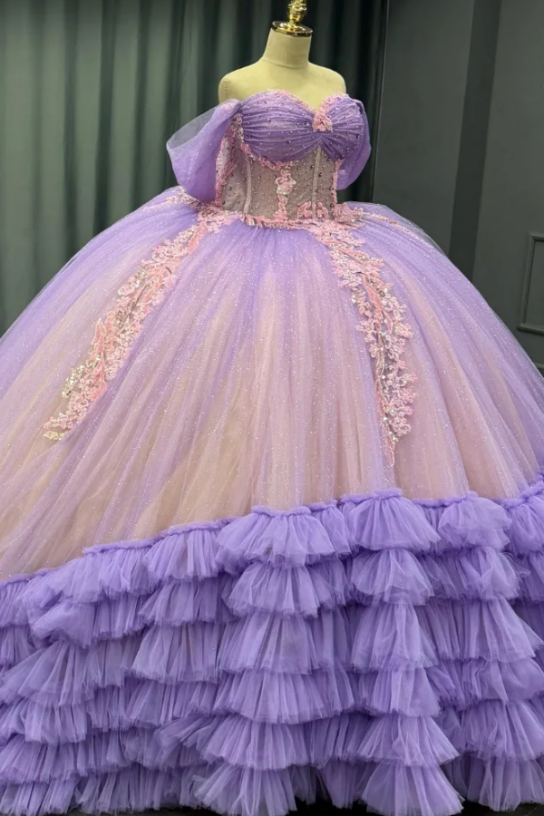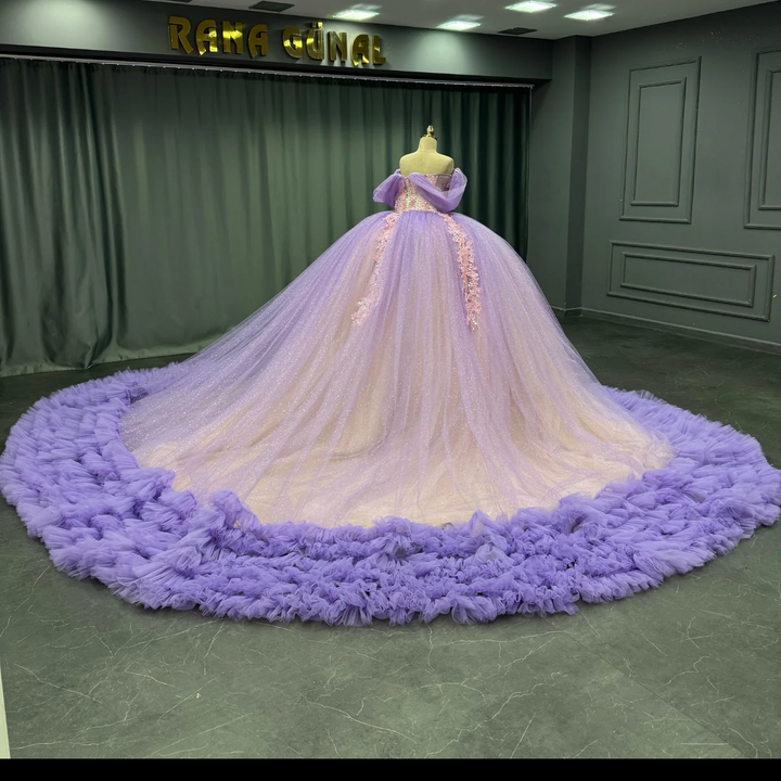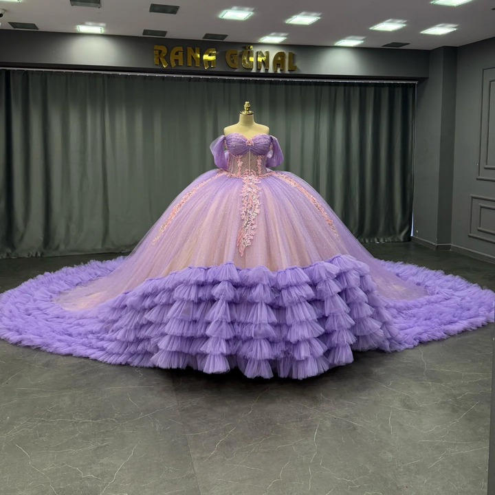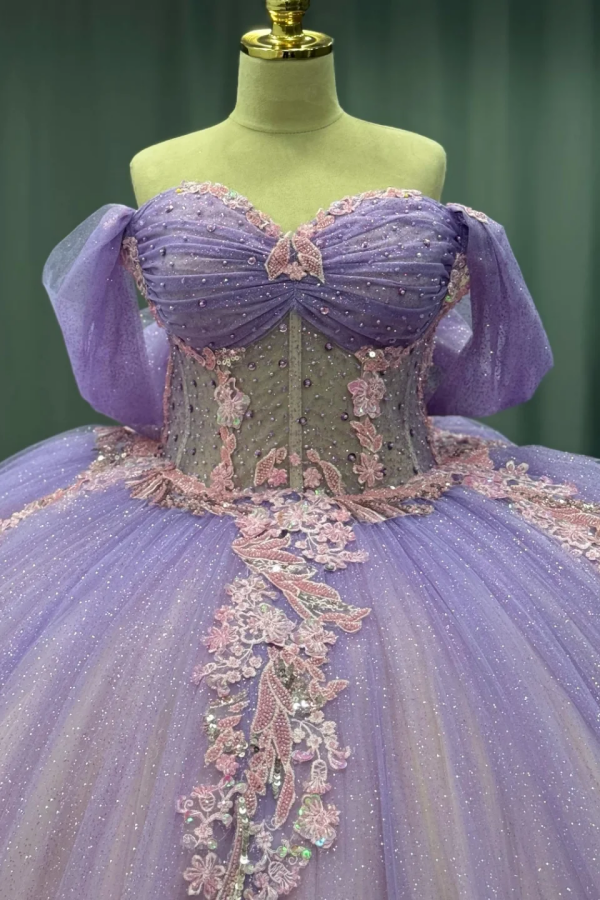 Langes Quinceanera-Kleid mit Herzausschnitt für Damen, trägerloses Korsett mit Blumenapplikationen, Perlenbesetztes Tüll-Ballkleid