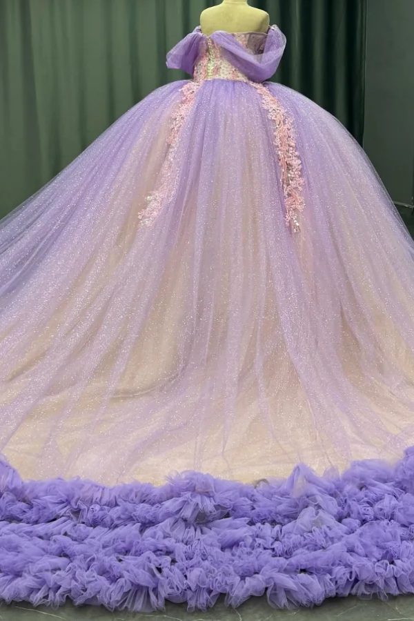 • Merkmale des Quinceanera-Kleides: Langes Ballkleid mit Blumenapplikationen und trägerlosem Korsett, verziert mit metallischen Stickereien und Kristallperlen; der volle Glitzertüllrock wurde passend dazu akzentuiert und verfügt über eine geformte Überlage und eine Kathedralenschleppe.