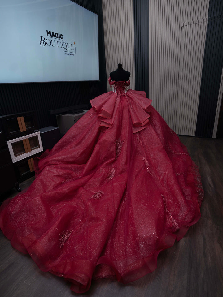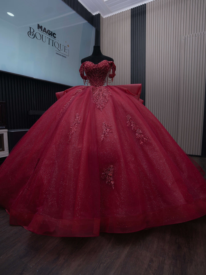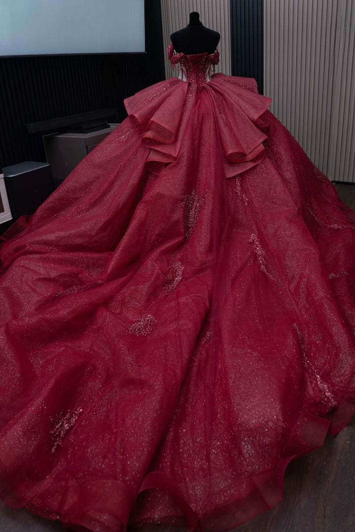 • Merkmale des Quinceanera-Kleides: Langes Ballkleid mit Blumenapplikationen und trägerlosem Korsett, verziert mit metallischen Stickereien und Kristallperlen; der volle Glitzertüllrock wurde passend dazu akzentuiert und verfügt über eine geformte Überlage und eine Kathedralenschleppe.