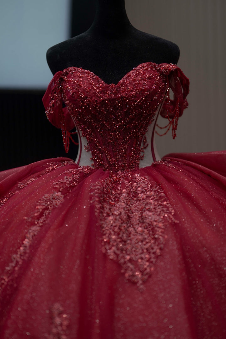 Langes Quinceanera-Kleid mit Herzausschnitt für Damen, trägerloses Korsett mit Blumenapplikationen, Perlenbesetztes Tüll-Ballkleid