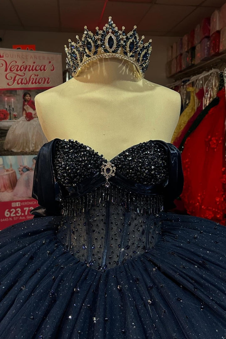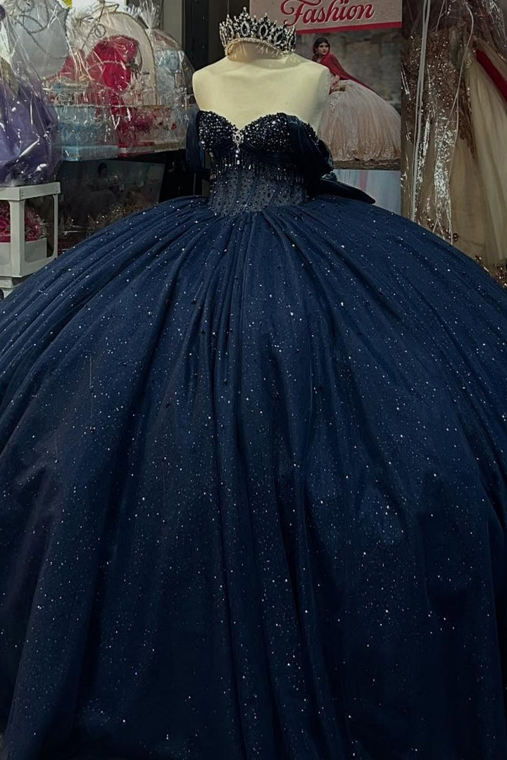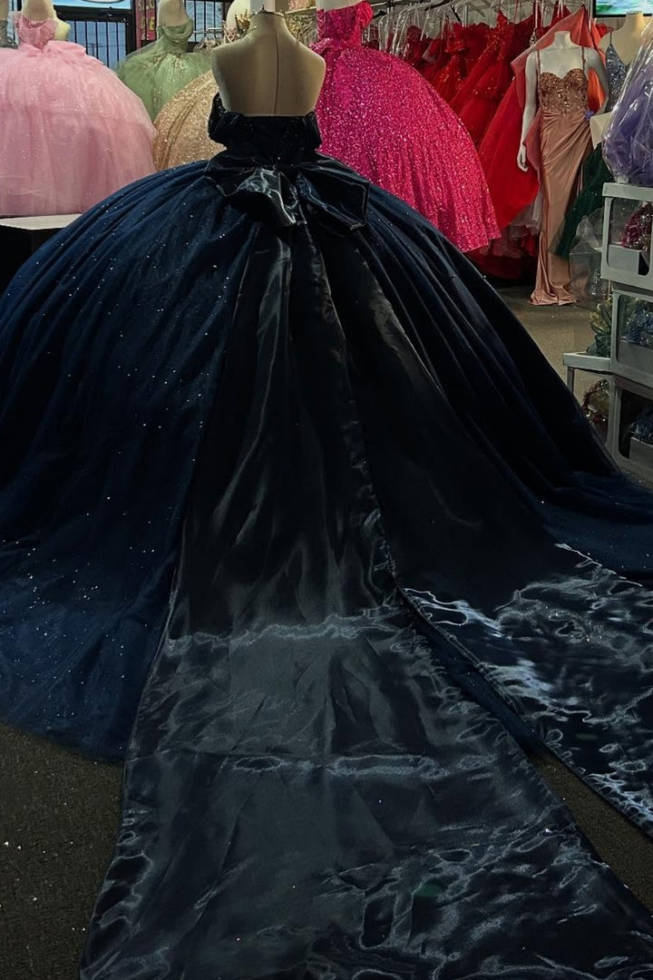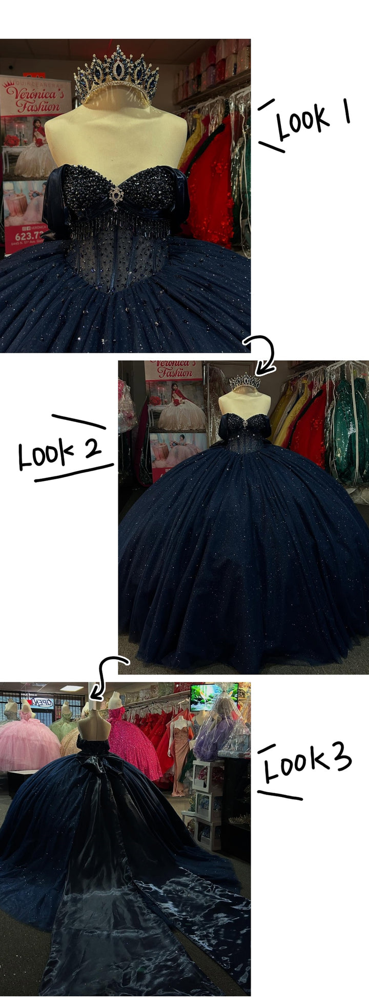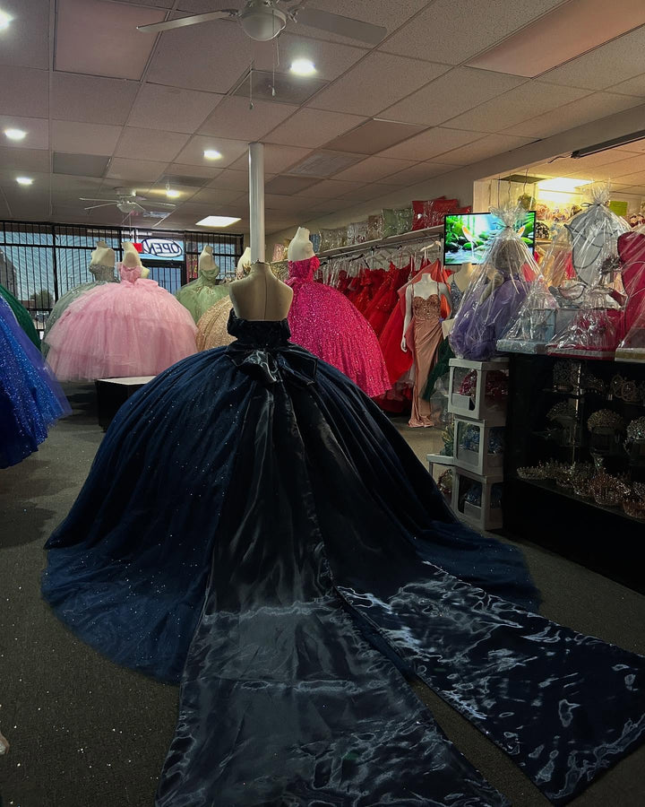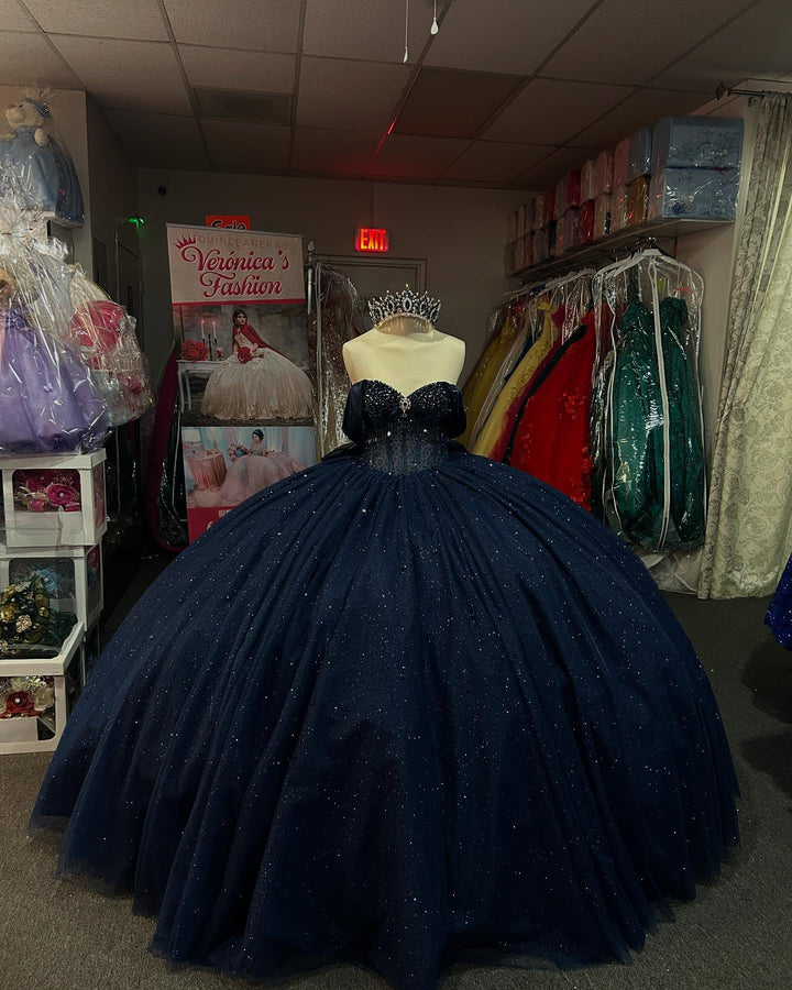 • Merkmale des Quinceanera-Kleides: Langes Ballkleid mit Blumenapplikationen und trägerlosem Korsett, verziert mit metallischen Stickereien und Kristallperlen; der volle Glitzertüllrock wurde passend dazu akzentuiert und verfügt über eine geformte Überlage und eine Kathedralenschleppe.