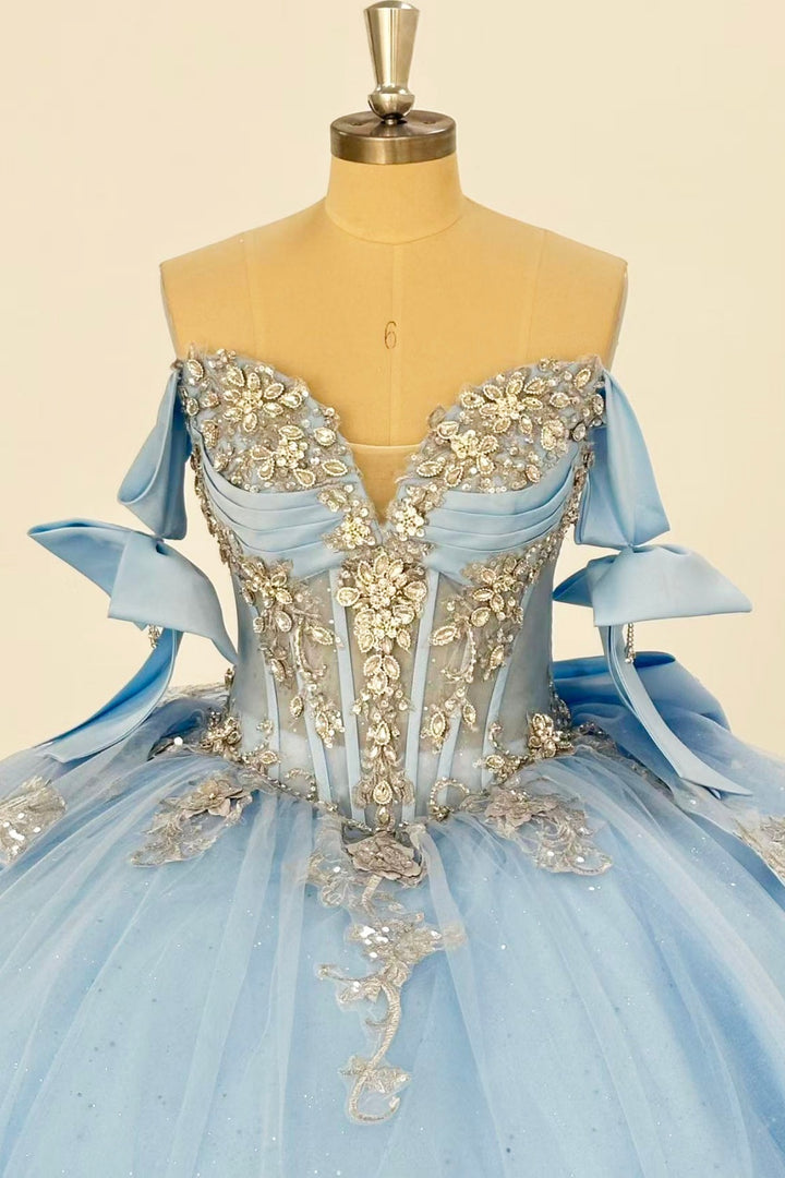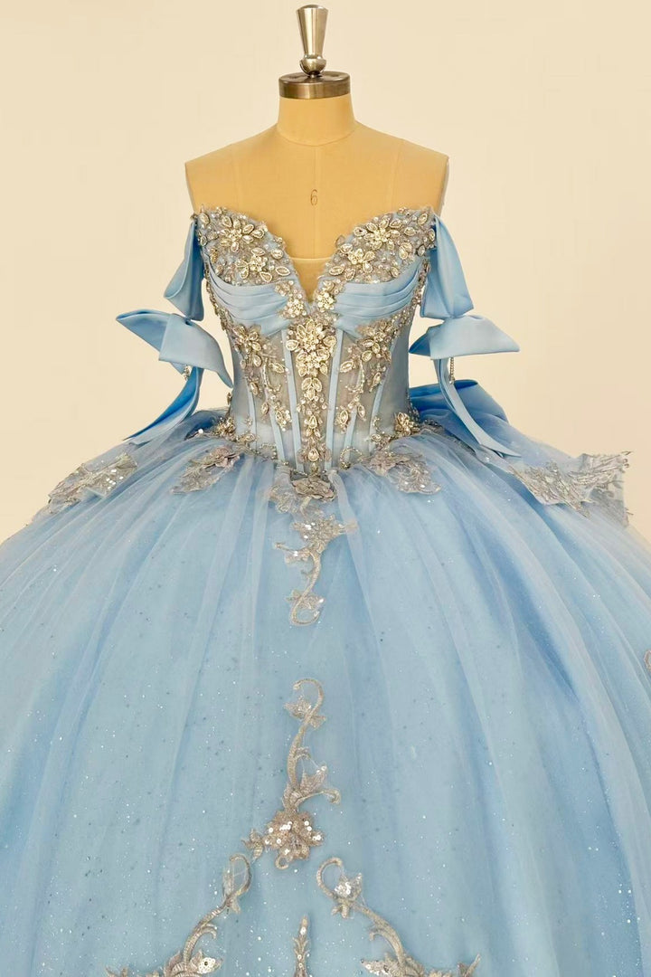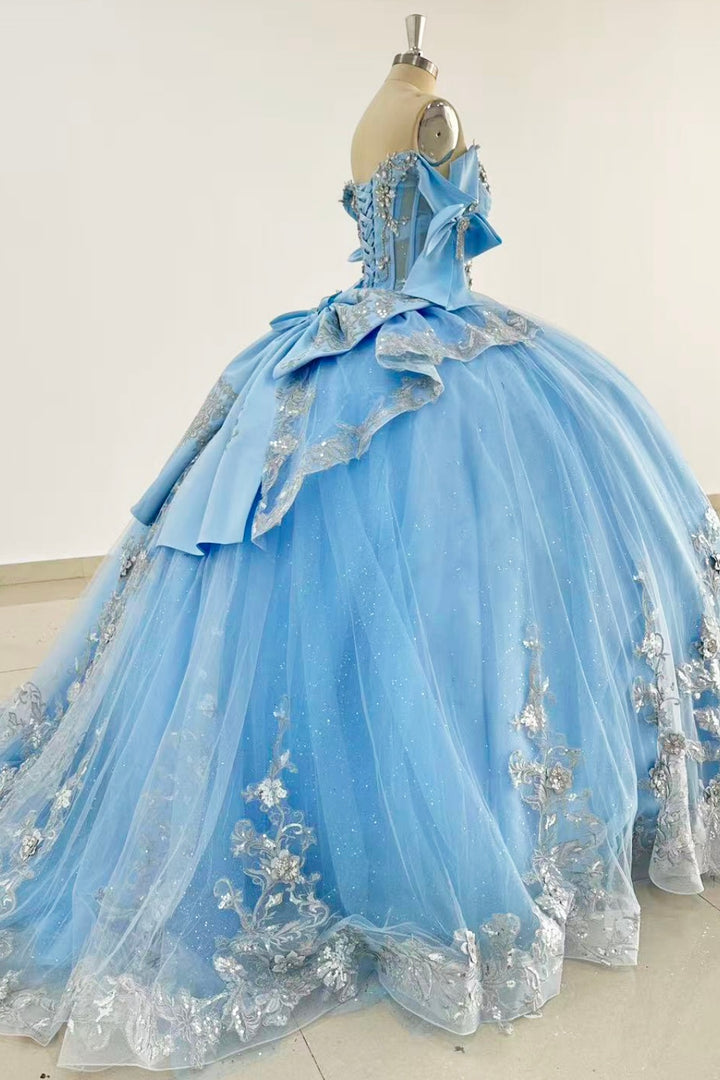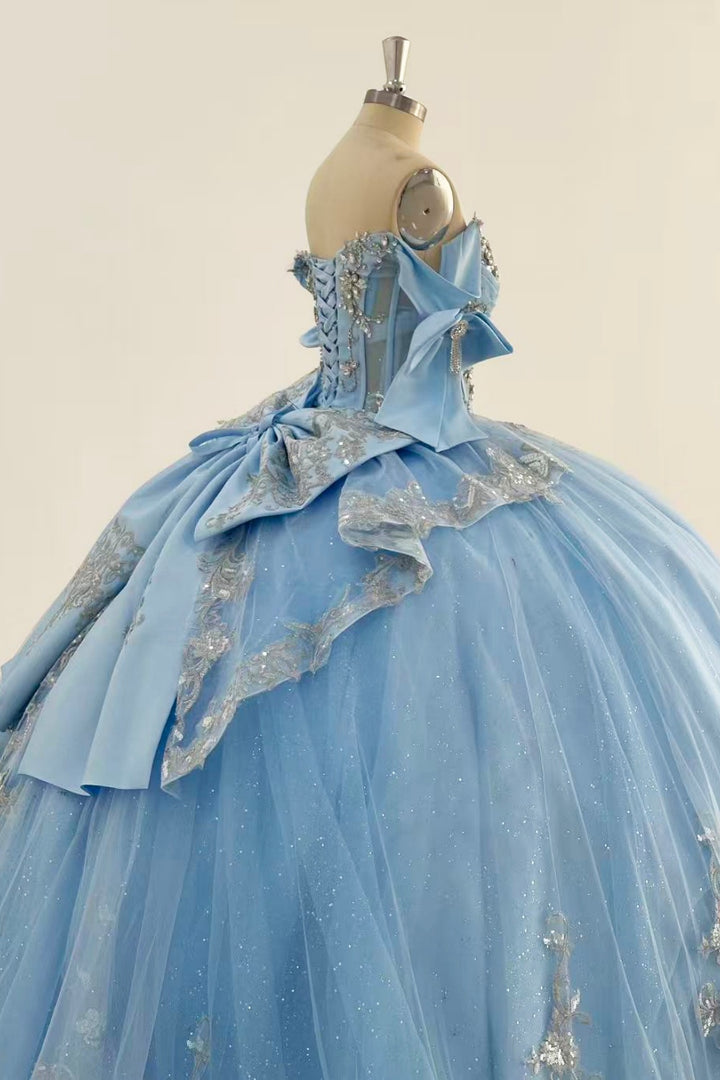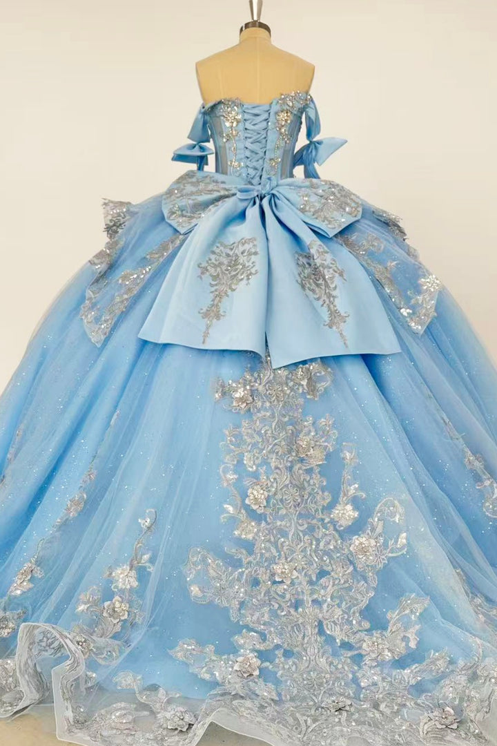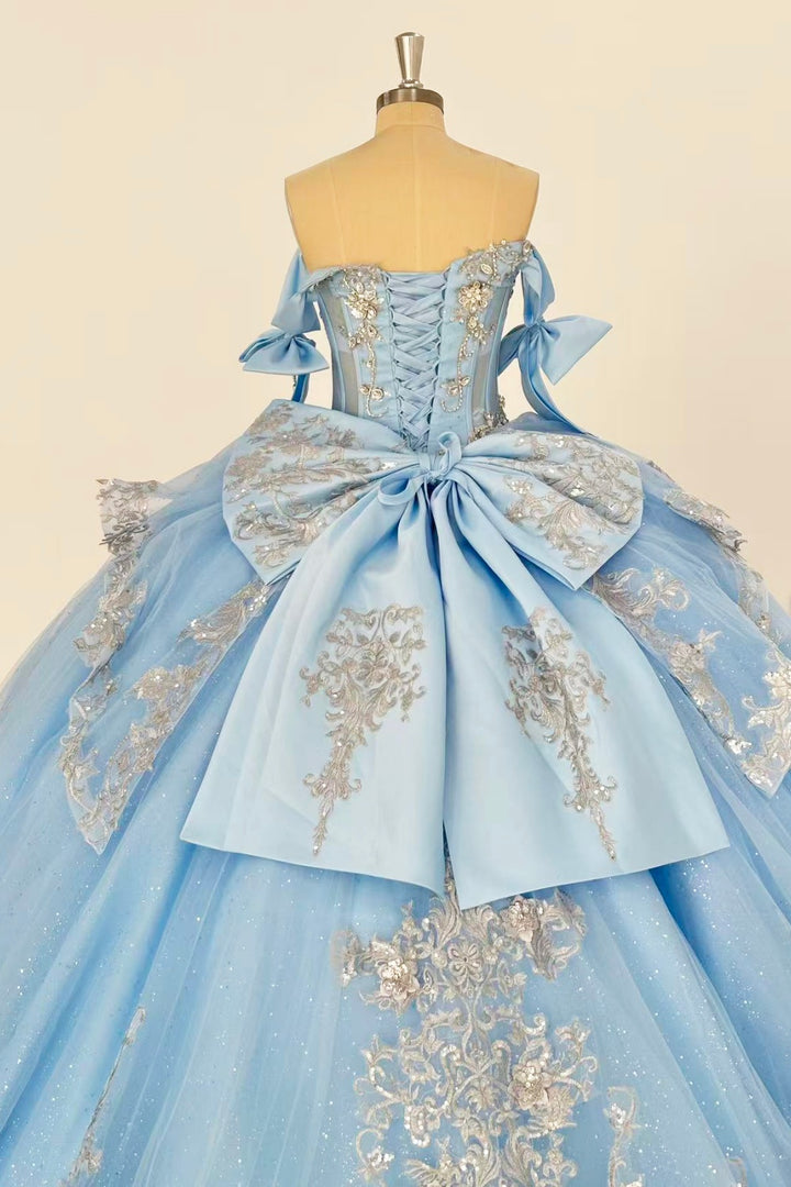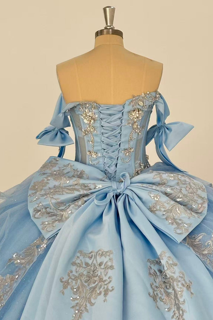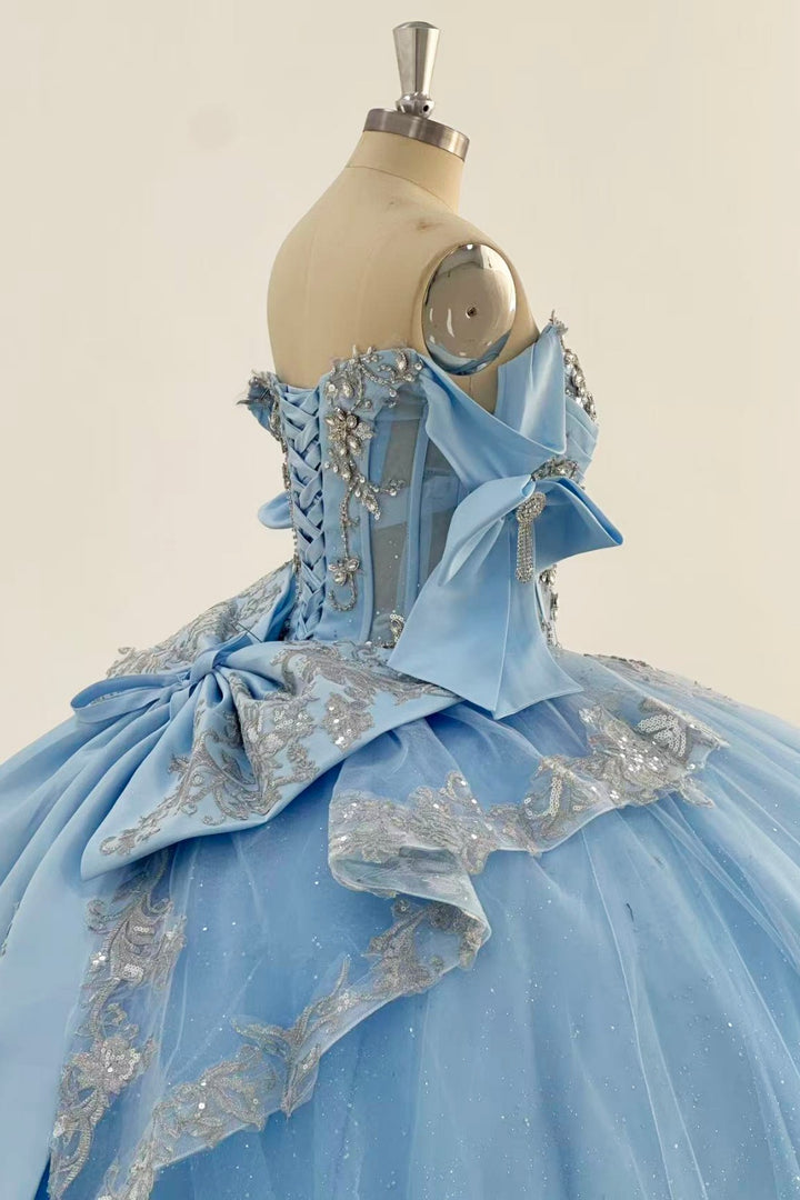 Off Shoulder Sleeveless Beaded Bow Knot Sliver Appliques Blue Sweet 15 Quinceañera Dress WQ1763