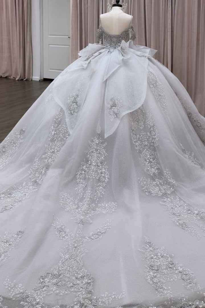Off Shoulder Sleeveless Beaded Crystal Appliques Silver Sweet 15 Quinceañera Dress WQ1662