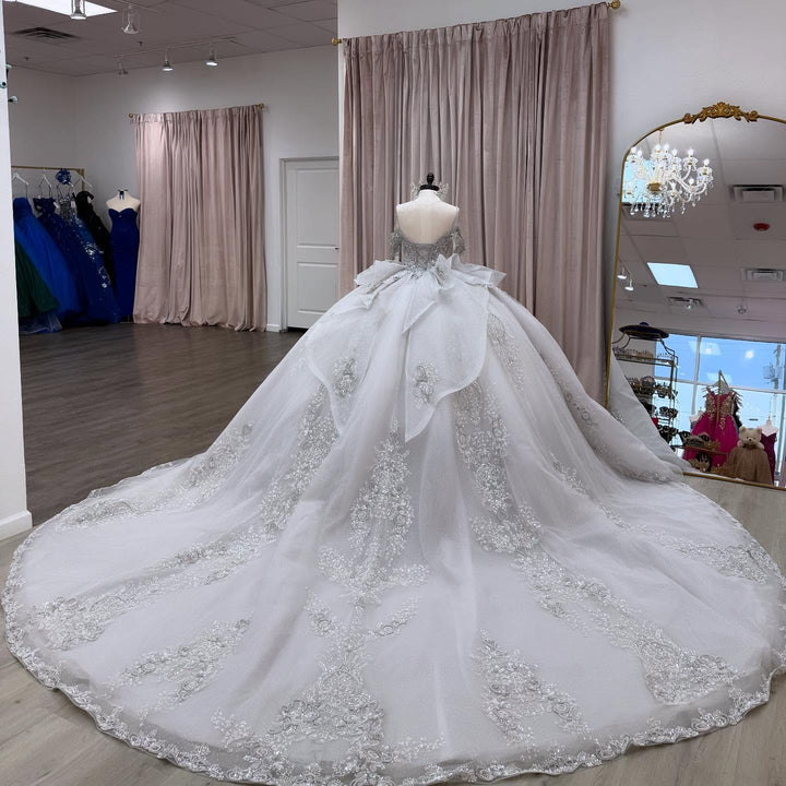 Description: This silver quinceañera dress features an elegant off-shoulder neckline and a sleeveless design, adorned with exquisite beaded crystal appliques that add luminous detail and sophistication. Crafted to highlight your poise and grace, this gown combines timeless style with sparkling accents, perfect for making a stunning impression on your Sweet 15 celebration.