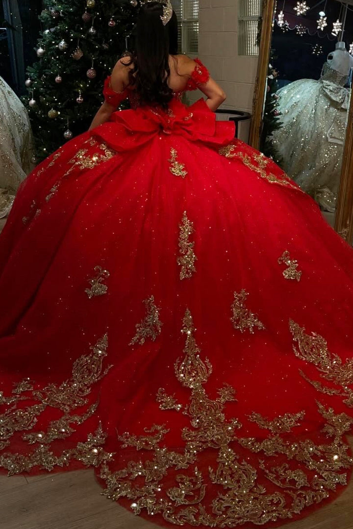 Off Shoulder Sleeveless Beaded Gold Appliques Red Sweet 15 Quinceañera Dress WQ1735