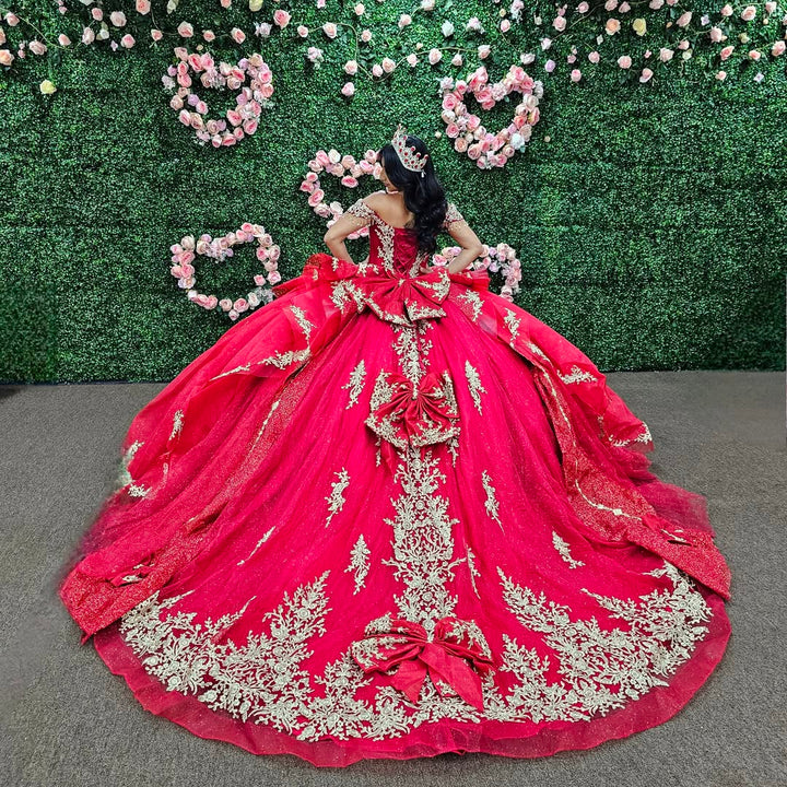 • Merkmale des Quinceanera-Kleides: Langes Ballkleid mit Blumenapplikationen und trägerlosem Korsett, verziert mit metallischen Stickereien und Kristallperlen; der volle Glitzertüllrock wurde passend dazu akzentuiert und verfügt über eine geformte Überlage und eine Kathedralenschleppe.