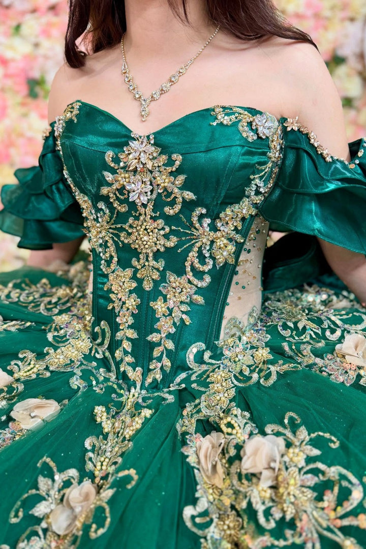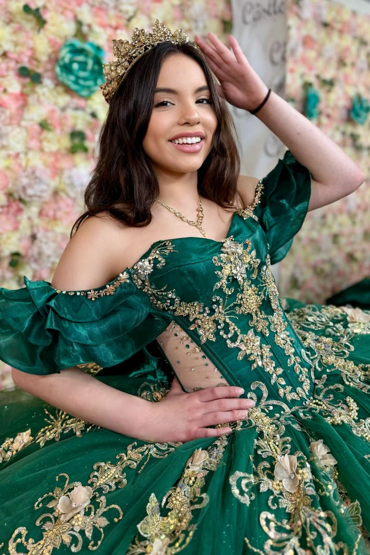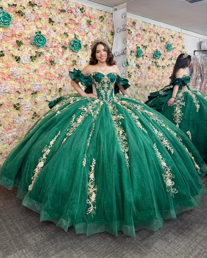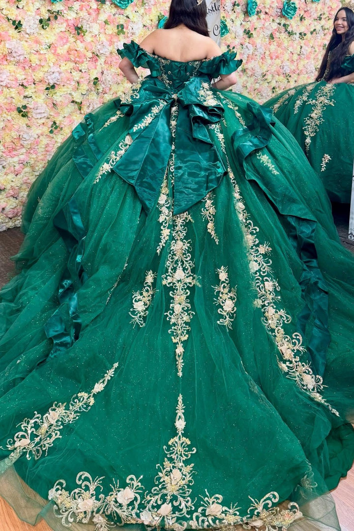 Description: Make a sophisticated statement at your quinceañera in this exquisite dark green gown. This off-shoulder masterpiece showcases intricate beadwork paired with lustrous gold sequins that radiate luxury and refinement. Elegant appliqués and a charming bow knot detail add distinctive character to the design, while the sleeveless silhouette provides a graceful, modern aesthetic. The rich emerald tone conveys maturity and elegance, setting you apart with timeless style. Every element has been thoughtfully crafted to enhance your natural beauty and create an unforgettable impression on your special night. Perfect for the discerning quinceañera who appreciates classic glamour with contemporary flair.