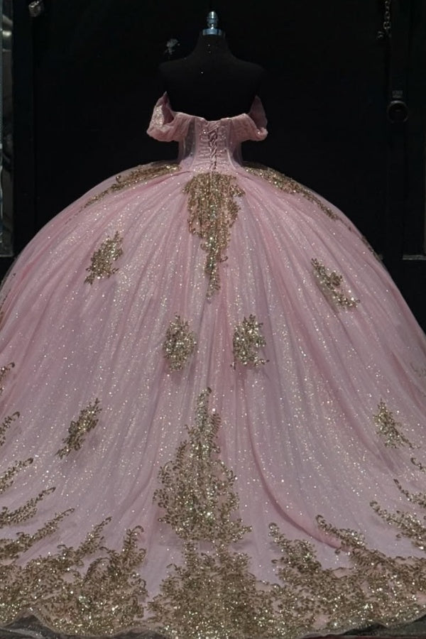• Merkmale des Quinceanera-Kleides: Langes Ballkleid mit Blumenapplikationen und trägerlosem Korsett, verziert mit metallischen Stickereien und Kristallperlen; der volle Glitzertüllrock wurde passend dazu akzentuiert und verfügt über eine geformte Überlage und eine Kathedralenschleppe.