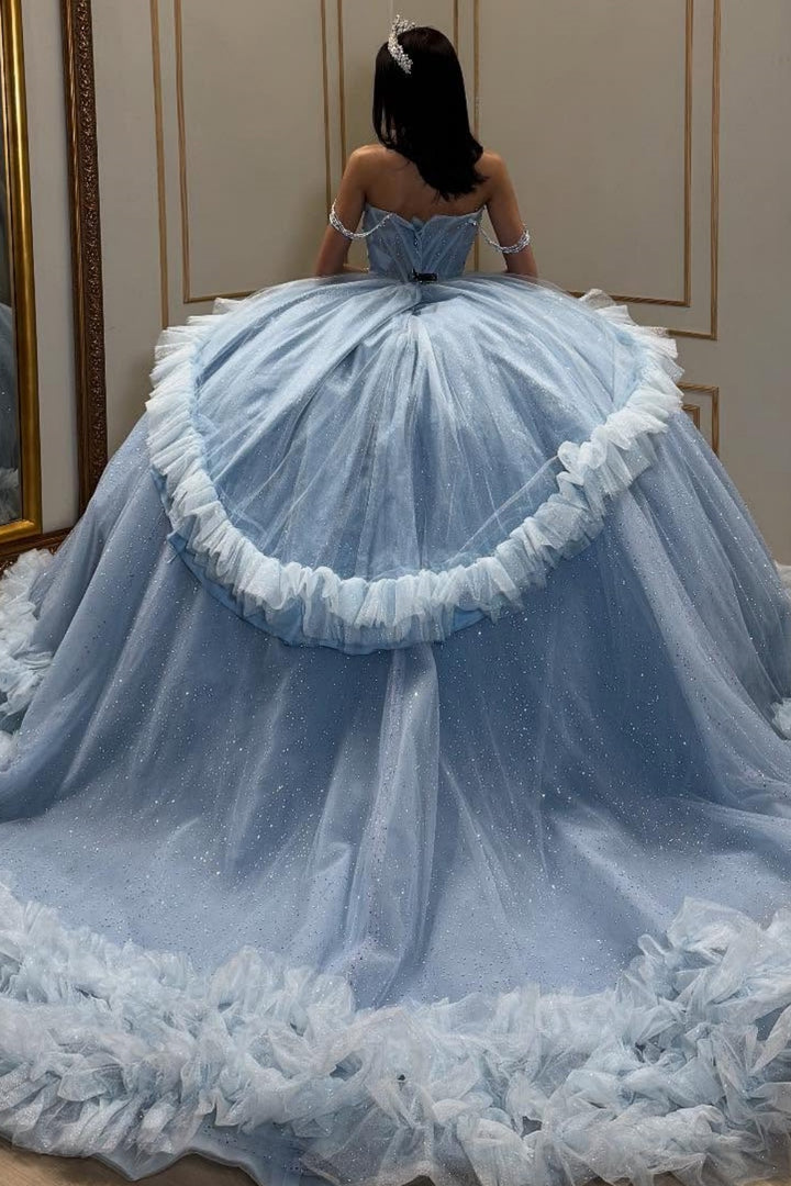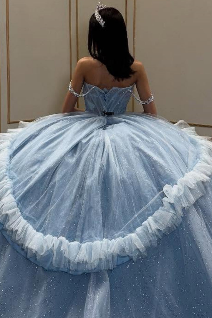 Off Shoulder Sleeveless Beaded Ruffles Blue Sweet 15 Quinceañera Dress WQ1728