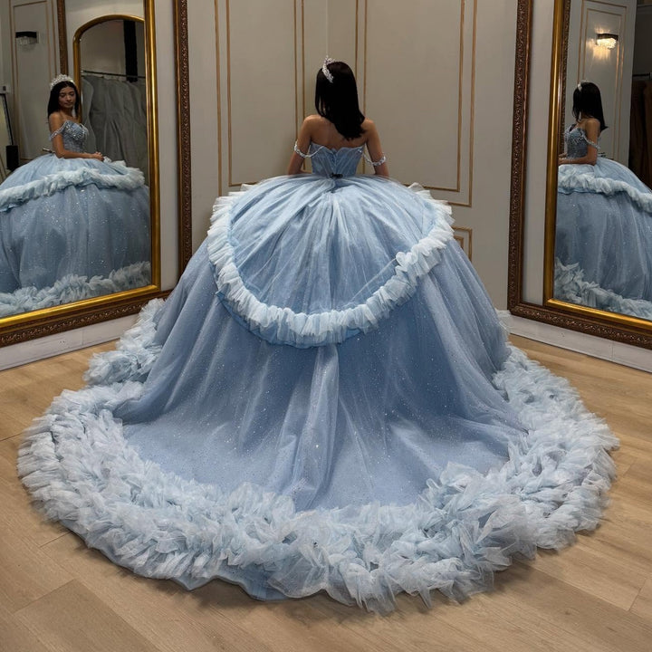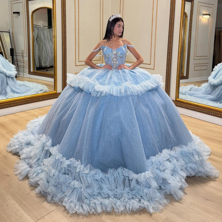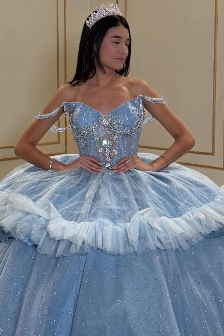 Description: Step into your quinceañera celebration wearing this breathtaking blue gown that embodies grace and sophistication. This sleeveless design features an alluring off-shoulder cut that elegantly frames the neckline, while intricate beading adorns the bodice with precision and artistry. Cascading ruffled layers create a romantic, voluminous silhouette that moves beautifully with every step. The serene blue tone conveys elegance and maturity, perfectly suited for marking this significant milestone. Expertly constructed with attention to every detail, this Sweet 15 dress combines classic femininity with contemporary design, allowing you to feel poised, confident, and absolutely radiant as you celebrate this cherished moment with loved ones.