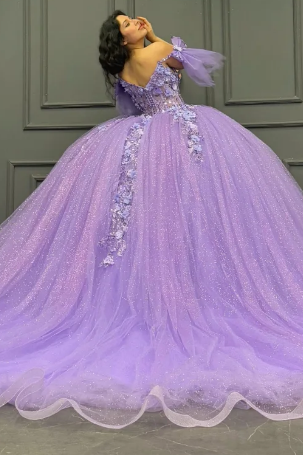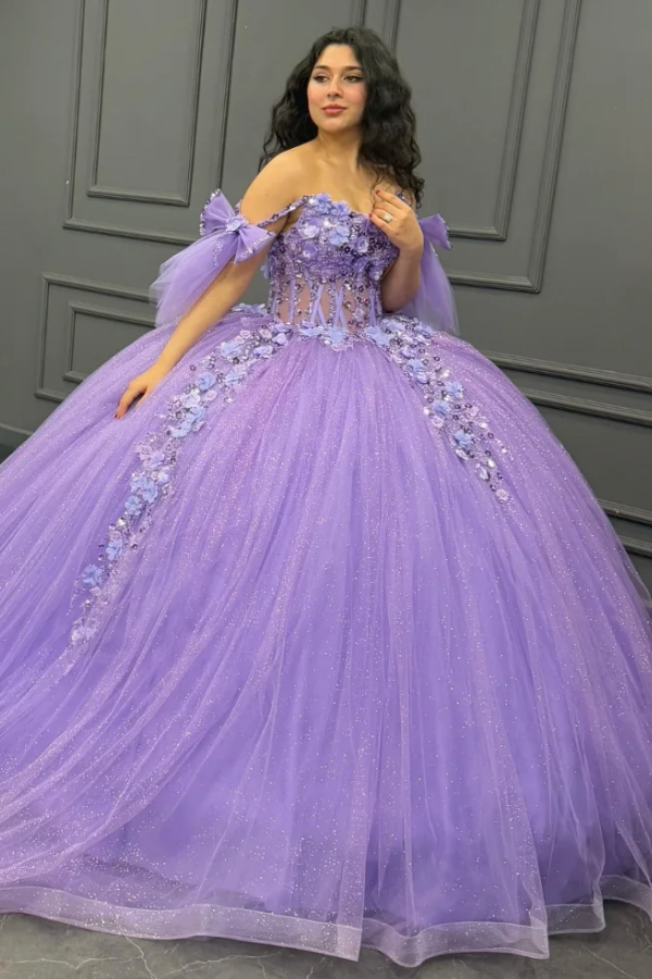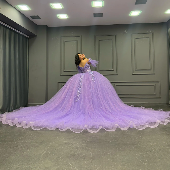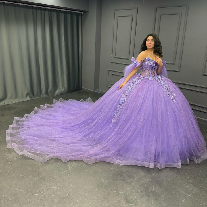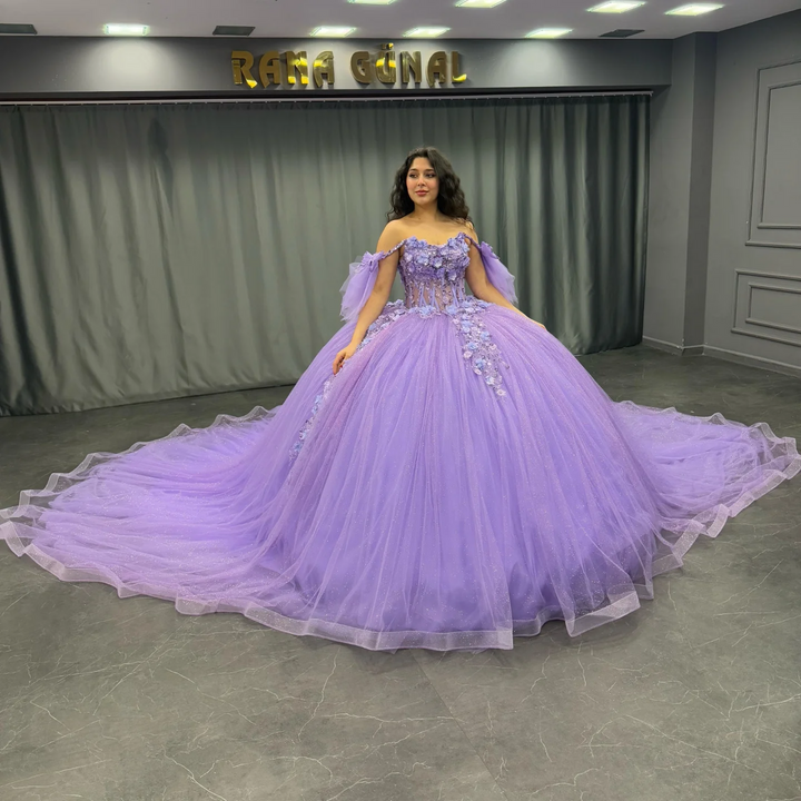 Langes Quinceanera-Kleid mit Herzausschnitt für Damen, trägerloses Korsett mit Blumenapplikationen, Perlenbesetztes Tüll-Ballkleid