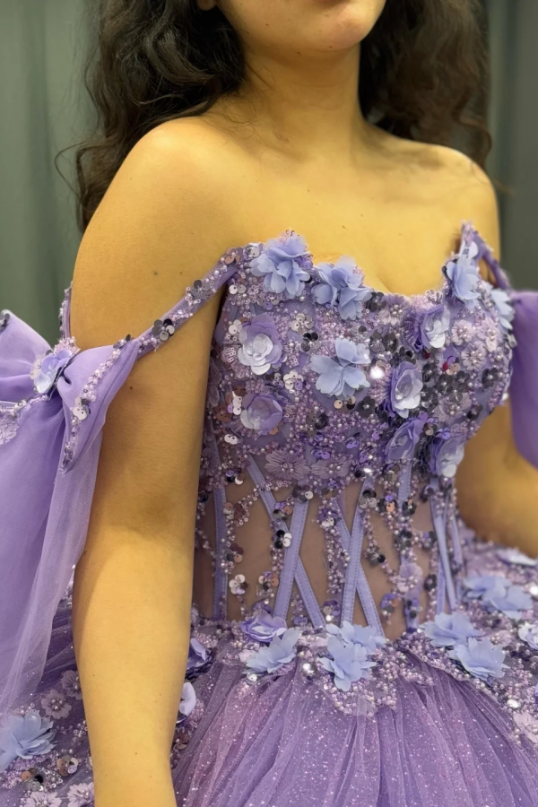 • Merkmale des Quinceanera-Kleides: Langes Ballkleid mit Blumenapplikationen und trägerlosem Korsett, verziert mit metallischen Stickereien und Kristallperlen; der volle Glitzertüllrock wurde passend dazu akzentuiert und verfügt über eine geformte Überlage und eine Kathedralenschleppe.