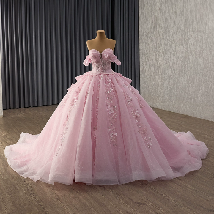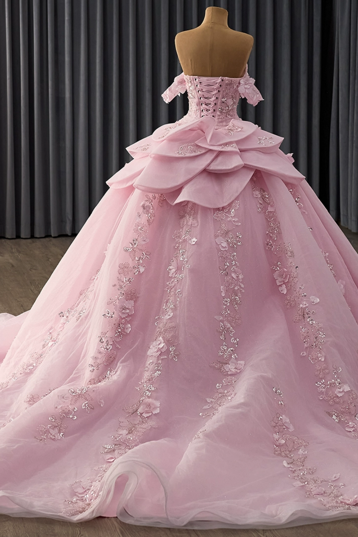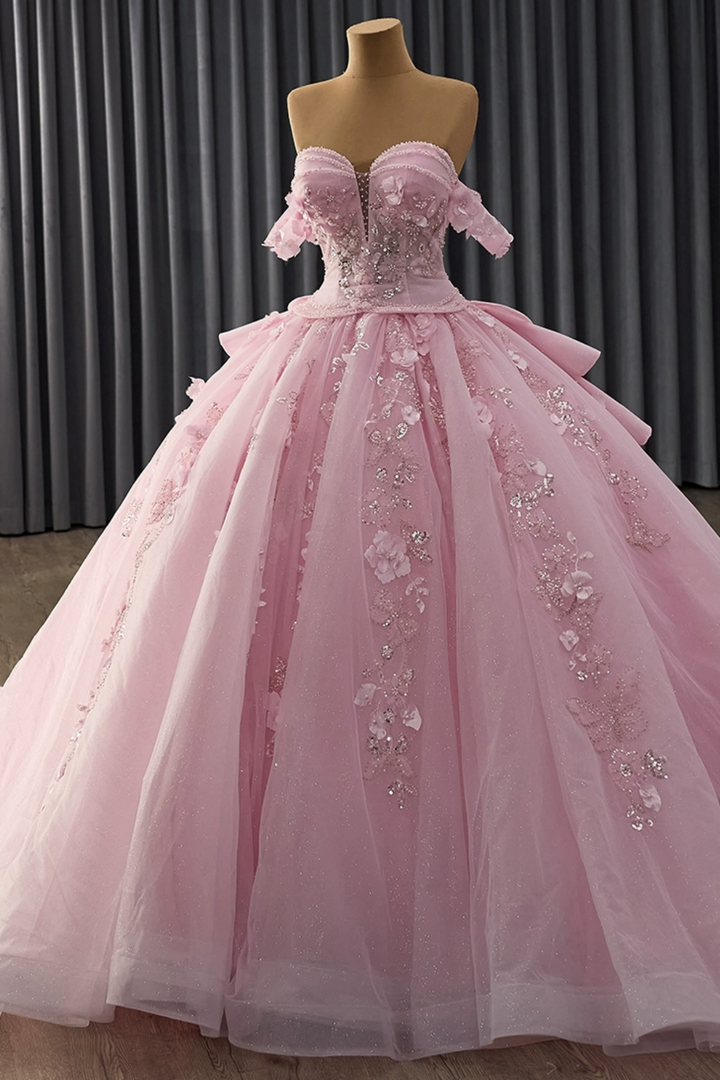 Description: Radiate elegance in this enchanting pink quinceañera gown designed to captivate. The off-shoulder neckline frames your face beautifully while the sleeveless cut provides a graceful, contemporary silhouette. Meticulously crafted with beaded embellishments and luminous sequins, the bodice features stunning 3D floral appliqués that add dimensional artistry and depth. Romantic ruffles cascade down the skirt, creating movement and volume with every step. This expertly constructed dress merges sophisticated craftsmanship with youthful charm, making it the perfect choice to commemorate your Sweet 15 in unforgettable style.