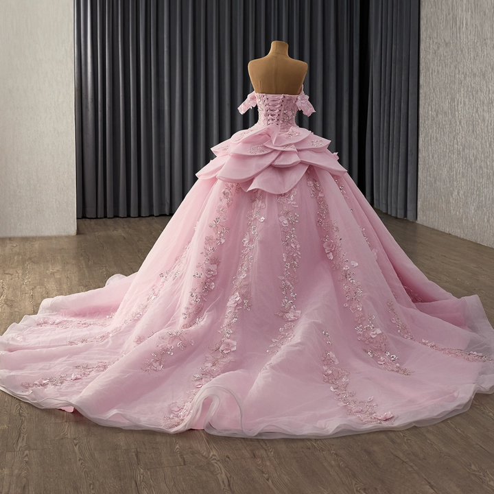 Off Shoulder Sleeveless Beaded Sequins 3D Flower Appliques Ruffles Pink Sweet 15 Quinceañera Dress WQ1783