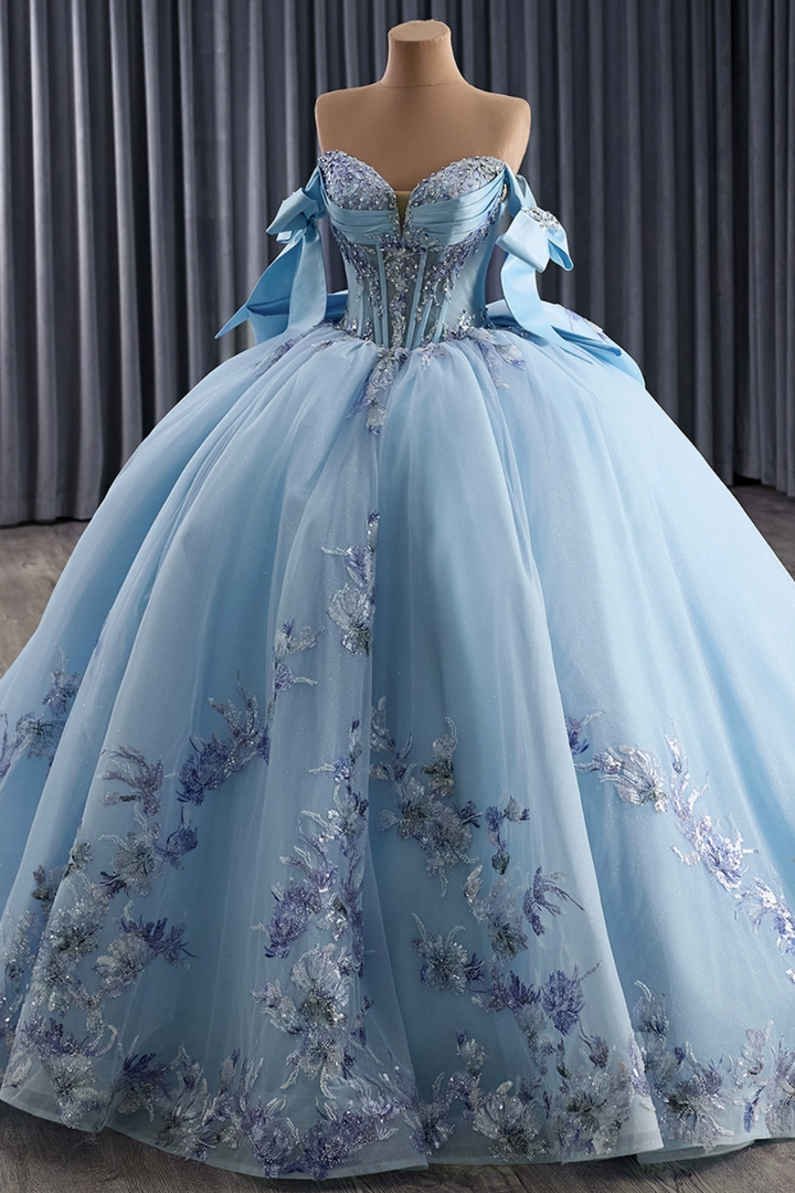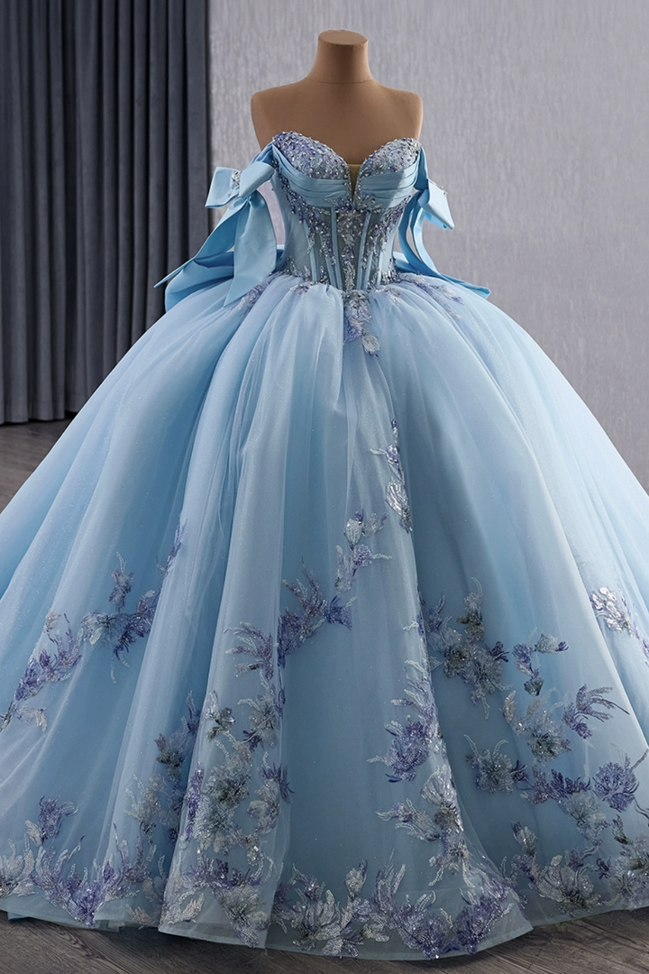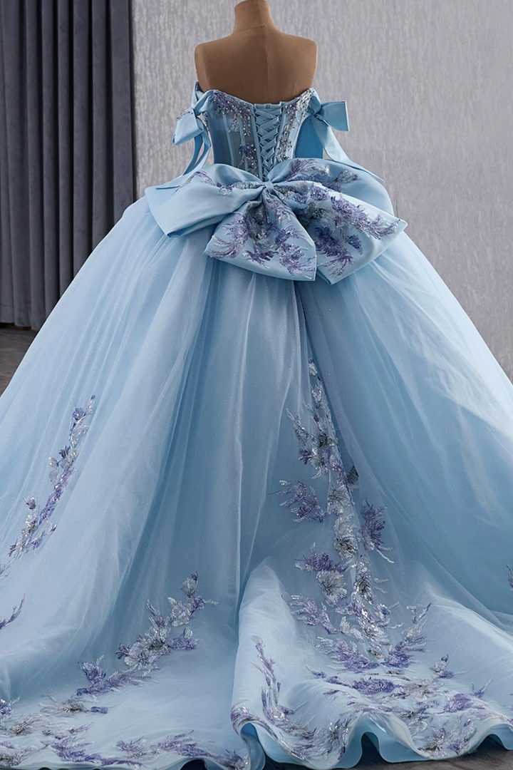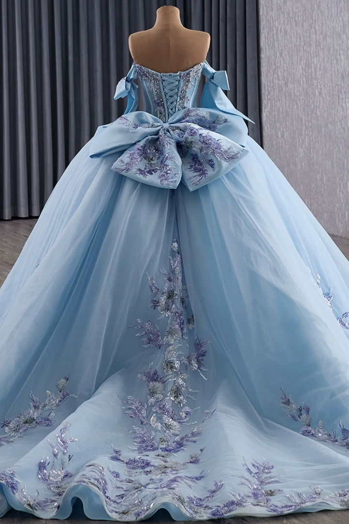 Off Shoulder Sleeveless Beaded Sequins Appliques Bow Knot Blue Sweet 15 Quinceañera Dress WQ1785