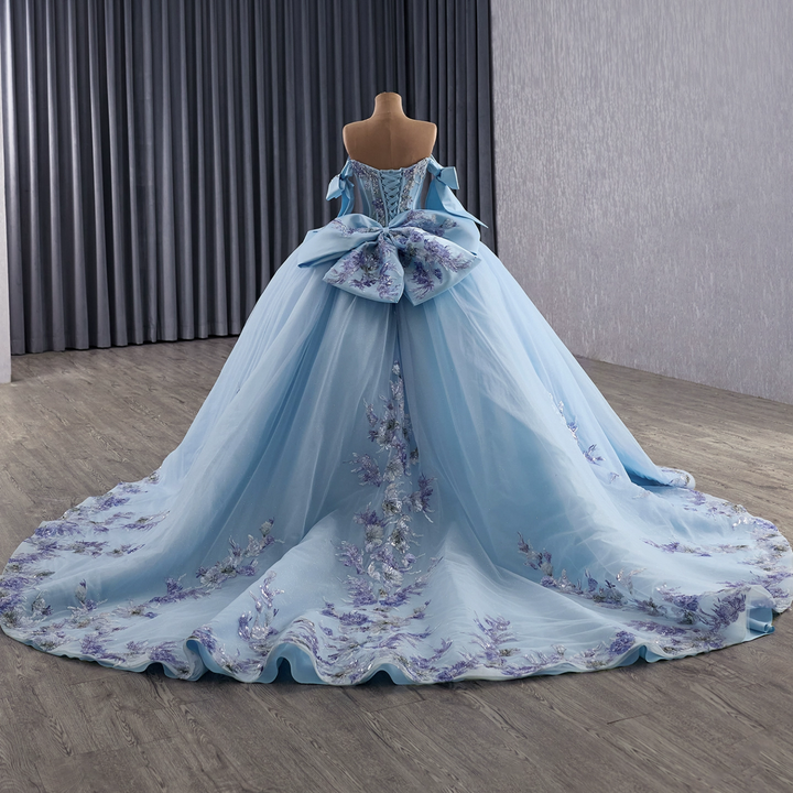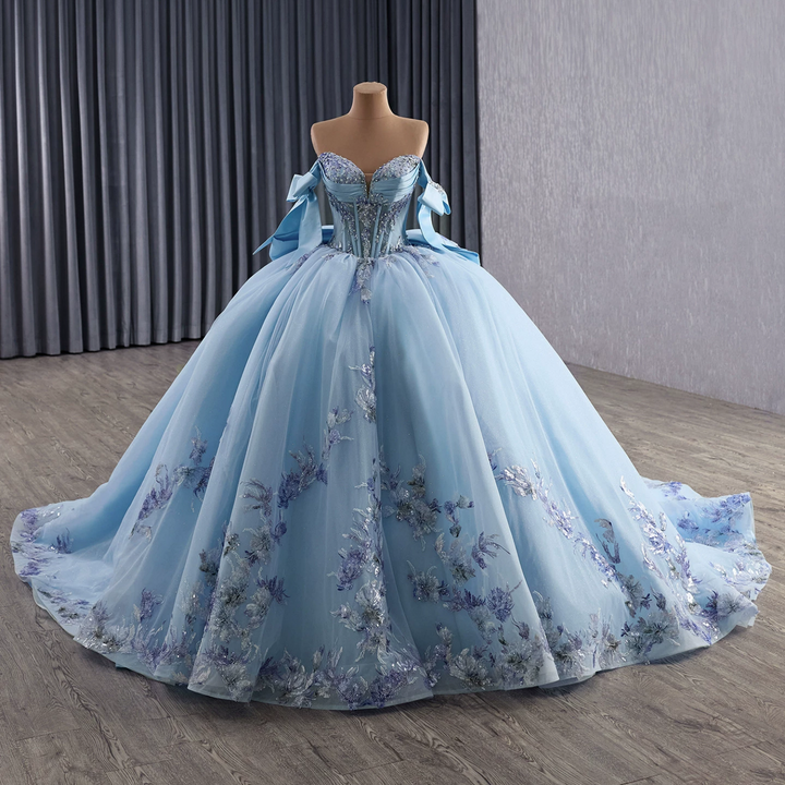 Description: Celebrate your quinceañera in timeless elegance with this stunning off-shoulder gown. Crafted in a luxurious blue hue, this sleeveless dress features intricate beaded embellishments and shimmering sequins that catch the light beautifully. Delicate appliqués and a charming bow knot detail add sophisticated flair to the bodice, creating a show-stopping silhouette perfect for your special milestone. The expertly constructed design ensures both comfort and grace throughout your celebration, making this dress an unforgettable choice for your Sweet 15.