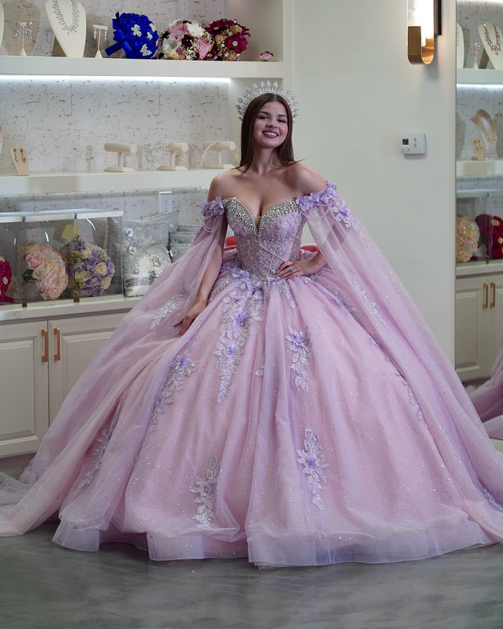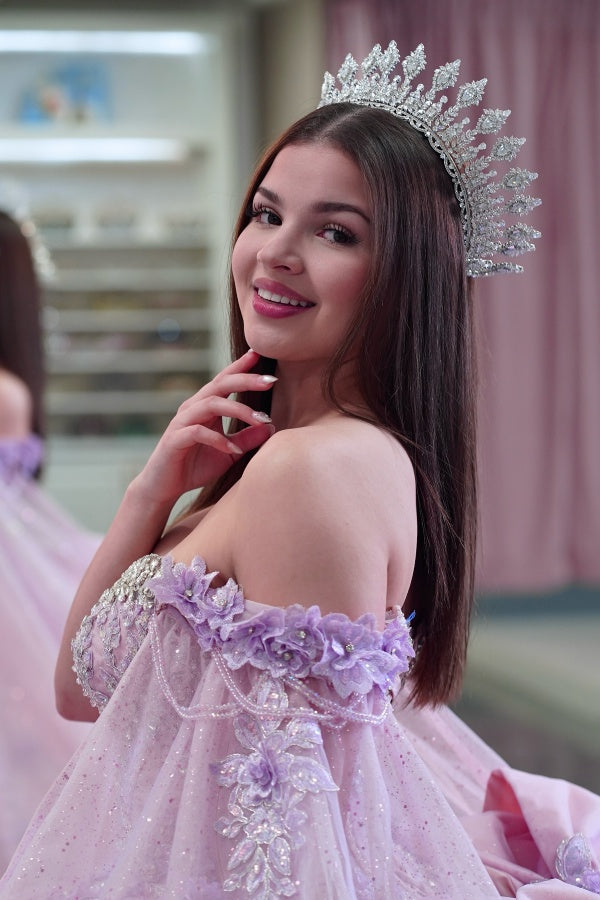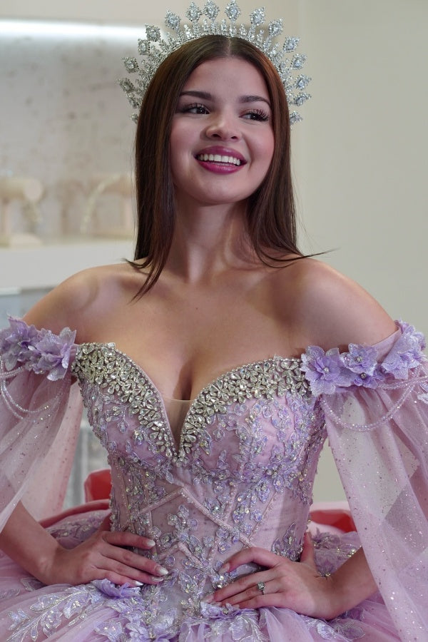 • Merkmale des Quinceanera-Kleides: Langes Ballkleid mit Blumenapplikationen und trägerlosem Korsett, verziert mit metallischen Stickereien und Kristallperlen; der volle Glitzertüllrock wurde passend dazu akzentuiert und verfügt über eine geformte Überlage und eine Kathedralenschleppe.