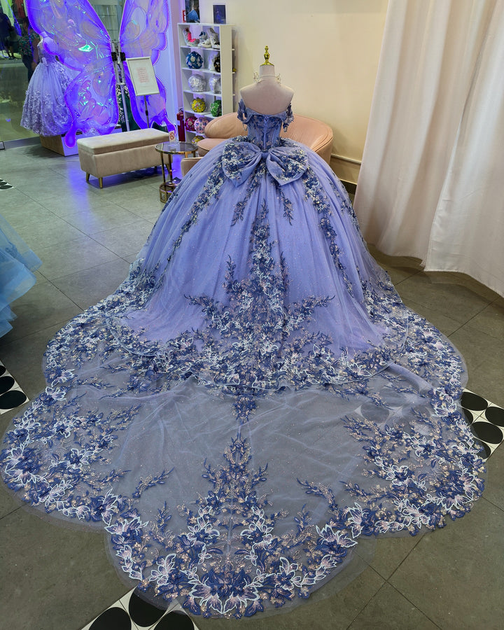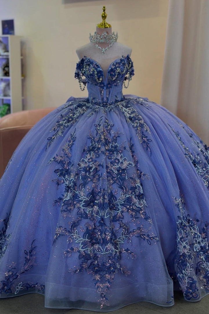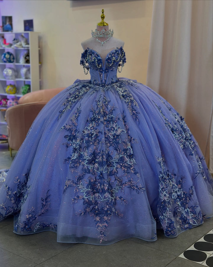 • Merkmale des Quinceanera-Kleides: Langes Ballkleid mit Blumenapplikationen und trägerlosem Korsett, verziert mit metallischen Stickereien und Kristallperlen; der volle Glitzertüllrock wurde passend dazu akzentuiert und verfügt über eine geformte Überlage und eine Kathedralenschleppe.