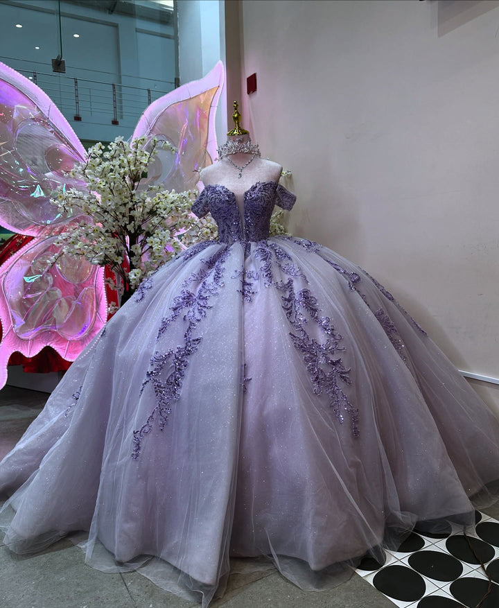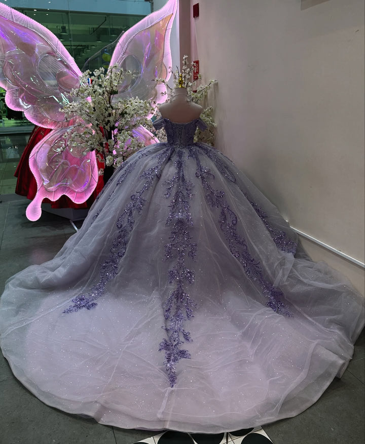 • Merkmale des Quinceanera-Kleides: Langes Ballkleid mit Blumenapplikationen und trägerlosem Korsett, verziert mit metallischen Stickereien und Kristallperlen; der volle Glitzertüllrock wurde passend dazu akzentuiert und verfügt über eine geformte Überlage und eine Kathedralenschleppe.