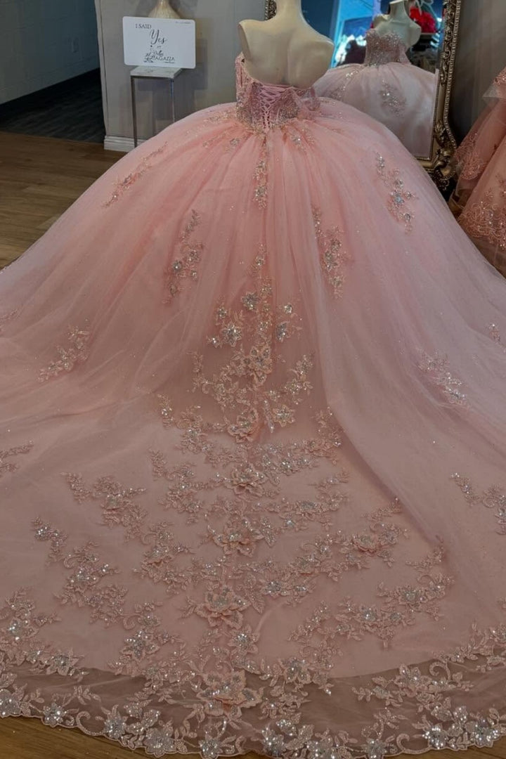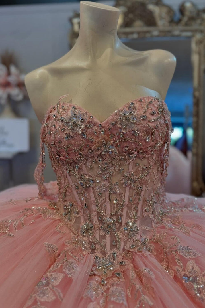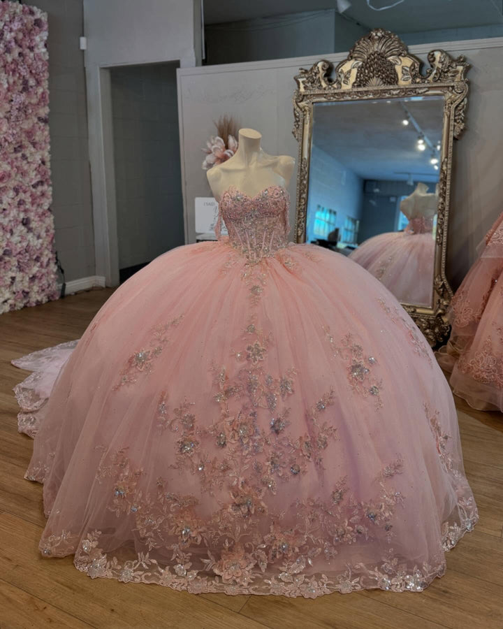 Langes Quinceanera-Kleid mit Herzausschnitt für Damen, trägerloses Korsett mit Blumenapplikationen, Perlenbesetztes Tüll-Ballkleid