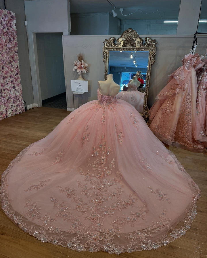 • Merkmale des Quinceanera-Kleides: Langes Ballkleid mit Blumenapplikationen und trägerlosem Korsett, verziert mit metallischen Stickereien und Kristallperlen; der volle Glitzertüllrock wurde passend dazu akzentuiert und verfügt über eine geformte Überlage und eine Kathedralenschleppe.