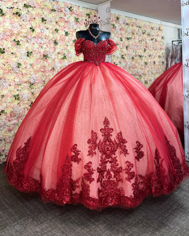• Merkmale des Quinceanera-Kleides: Langes Ballkleid mit Blumenapplikationen und trägerlosem Korsett, verziert mit metallischen Stickereien und Kristallperlen; der volle Glitzertüllrock wurde passend dazu akzentuiert und verfügt über eine geformte Überlage und eine Kathedralenschleppe.