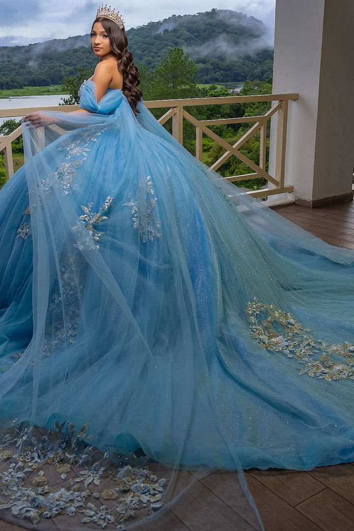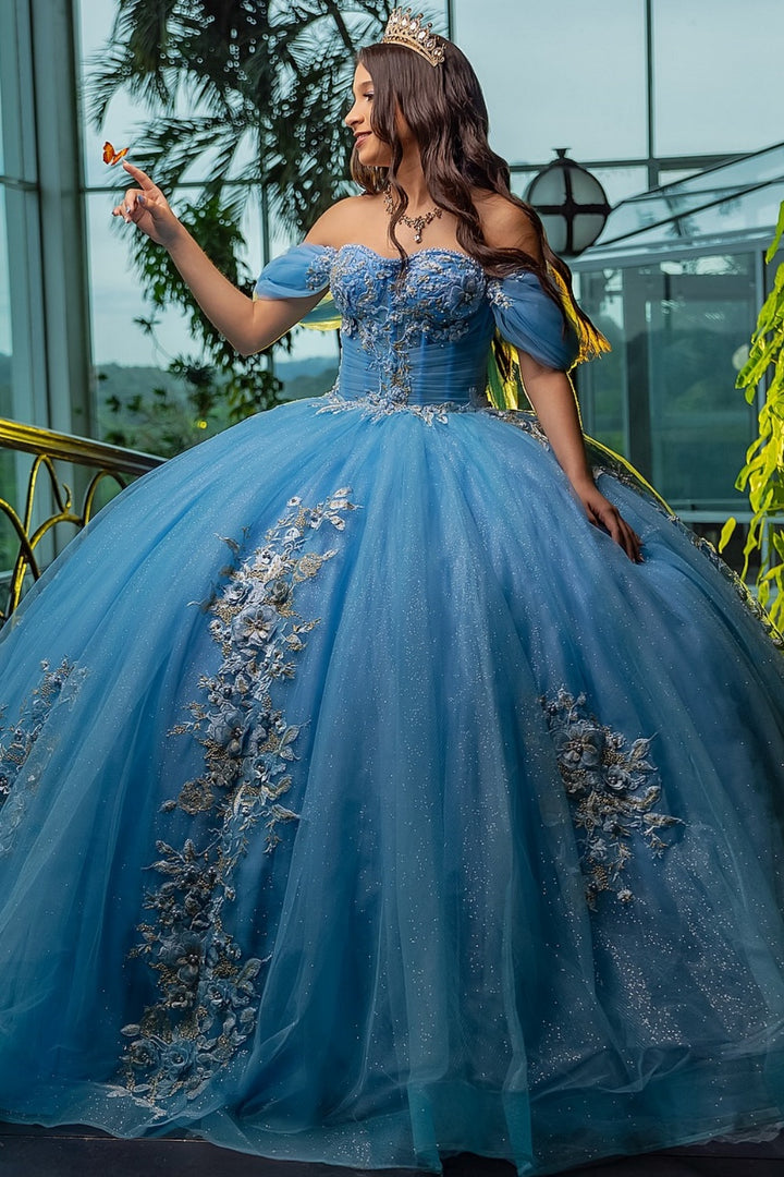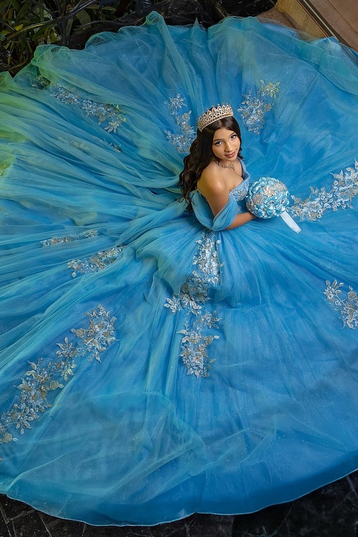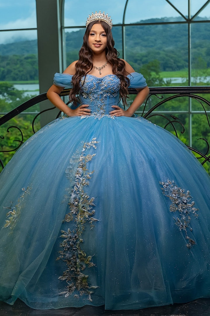 Description: Make a radiant statement at your quinceañera in this exquisite blue gown. Featuring an elegant off-shoulder neckline and sleeveless silhouette, the dress showcases intricate beaded and sequin embellishments paired with dimensional flower appliques for captivating visual appeal. The shimmering details catch light beautifully, creating a luminous effect throughout the evening. This sophisticated Sweet 15 dress balances glamour with refined elegance, offering a striking alternative to traditional white. Designed for those who desire a bold yet graceful presence, it transforms your milestone celebration into an unforgettable moment of pure sophistication.