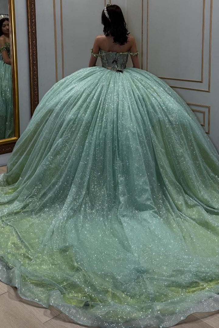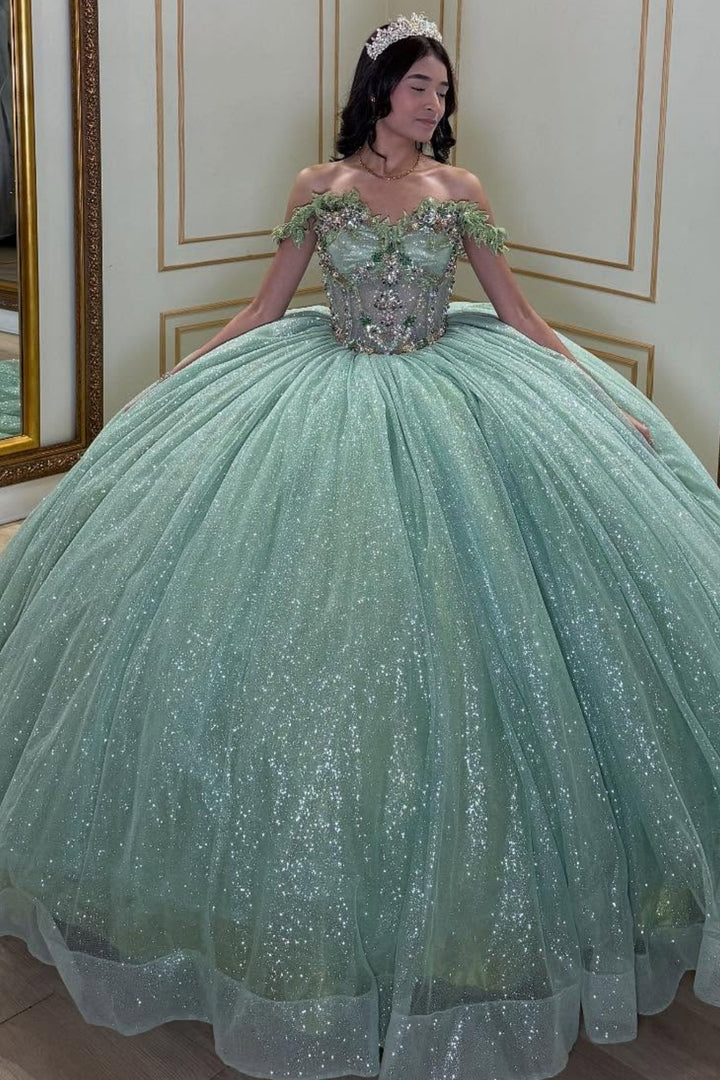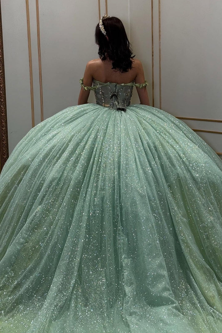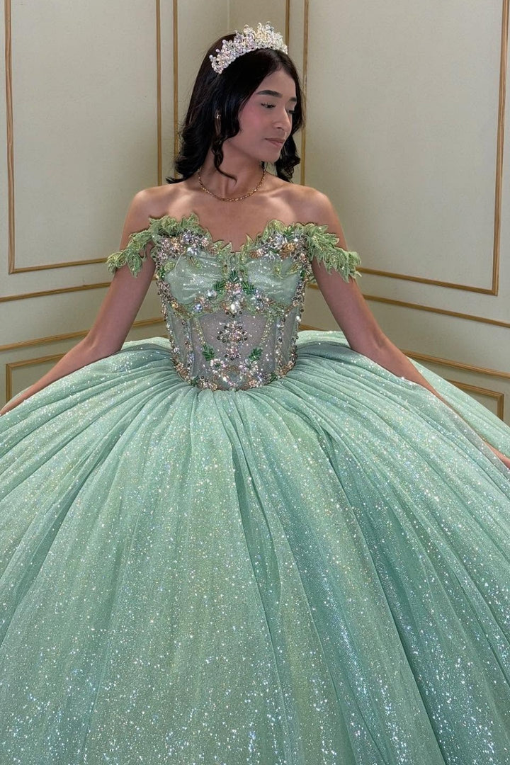 Off Shoulder Sleeveless Beaded Sequins Green Sweet 15 Quinceañera Dress WQ1685
