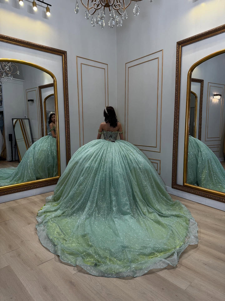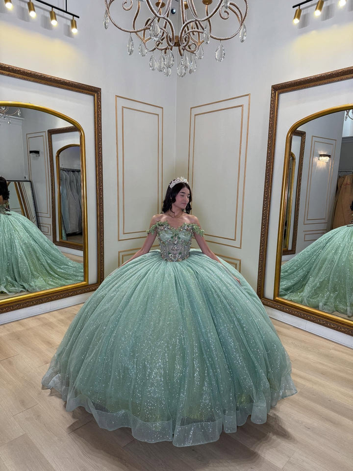 Description: Celebrate your Sweet 15 in elegance with this off-shoulder, sleeveless quinceañera dress. Featuring intricate beaded sequins, the vibrant green fabric offers a dazzling look while ensuring you stand out on your special day. Its flattering silhouette combines classic charm with youthful grace, perfect for memorable moments and stunning photos.