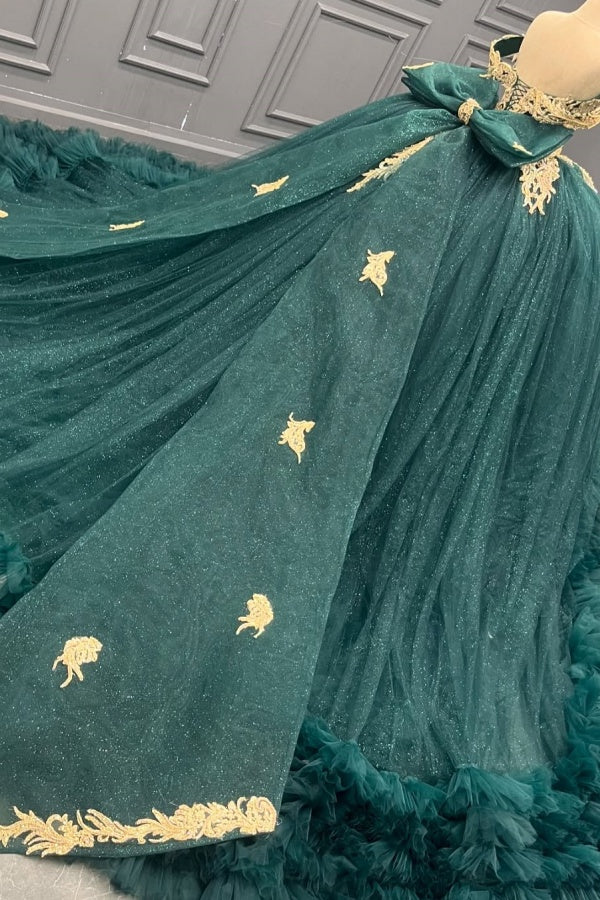 • Merkmale des Quinceanera-Kleides: Langes Ballkleid mit Blumenapplikationen und trägerlosem Korsett, verziert mit metallischen Stickereien und Kristallperlen; der volle Glitzertüllrock wurde passend dazu akzentuiert und verfügt über eine geformte Überlage und eine Kathedralenschleppe.