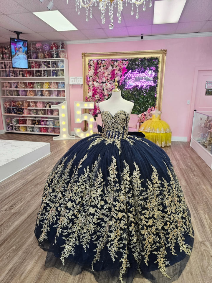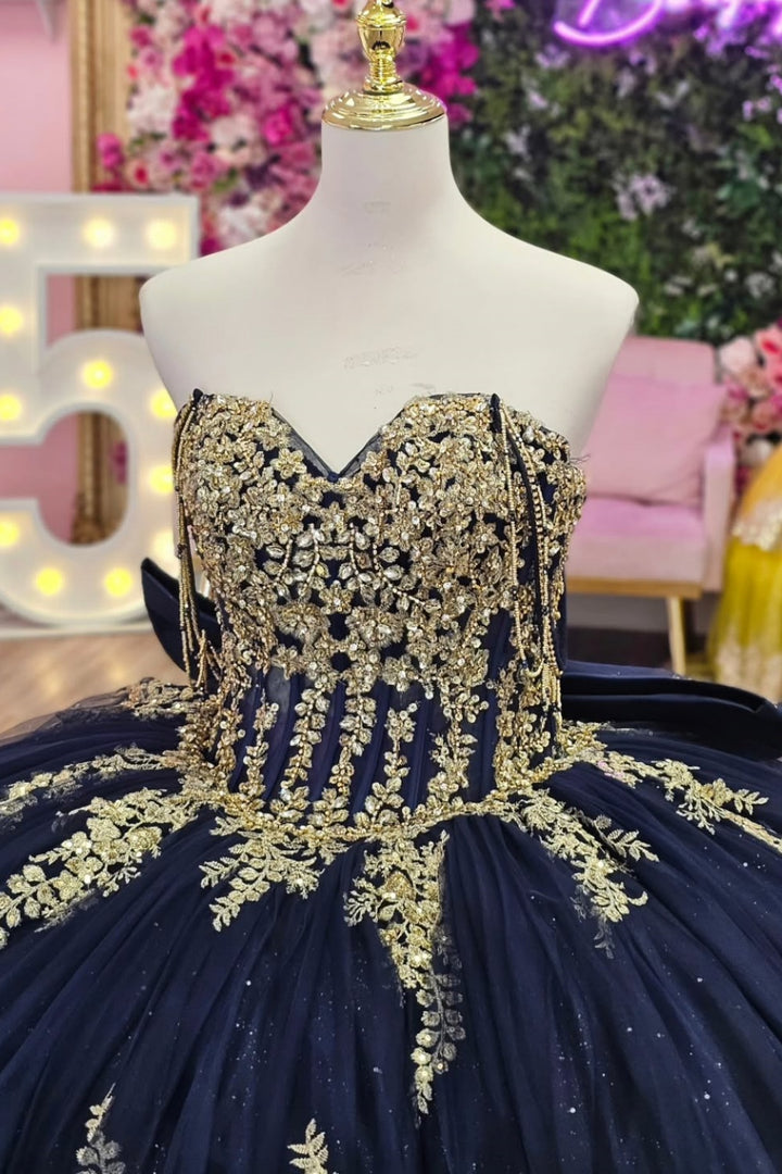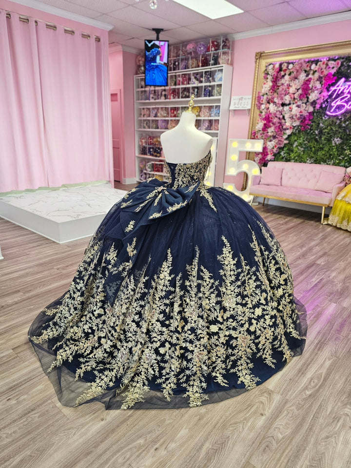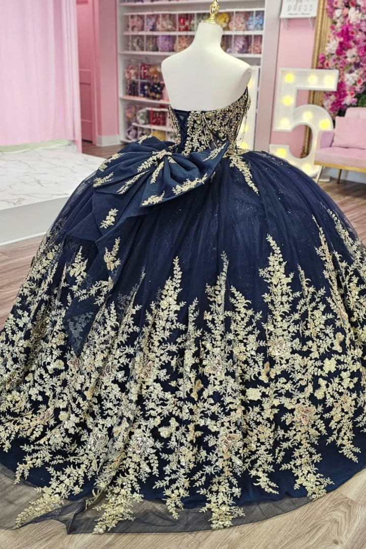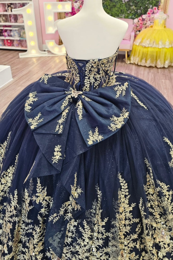Description: This off-shoulder, sleeveless Sweet 15 quinceañera dress in navy is adorned with intricate gold beaded sequins appliques, creating a striking contrast that exudes elegance. The subtle bow knot detail adds a refined touch, enhancing the sophisticated silhouette. Designed to provide comfort and confidence, this gown is an ideal choice for a memorable and stylish celebration.