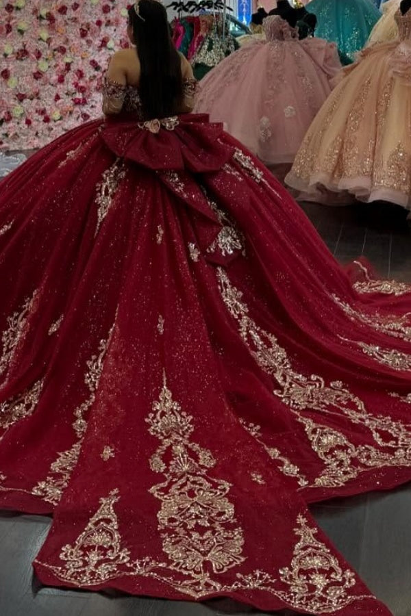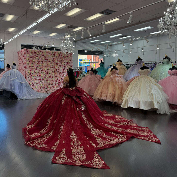 • Merkmale des Quinceanera-Kleides: Langes Ballkleid mit Blumenapplikationen und trägerlosem Korsett, verziert mit metallischen Stickereien und Kristallperlen; der volle Glitzertüllrock wurde passend dazu akzentuiert und verfügt über eine geformte Überlage und eine Kathedralenschleppe.