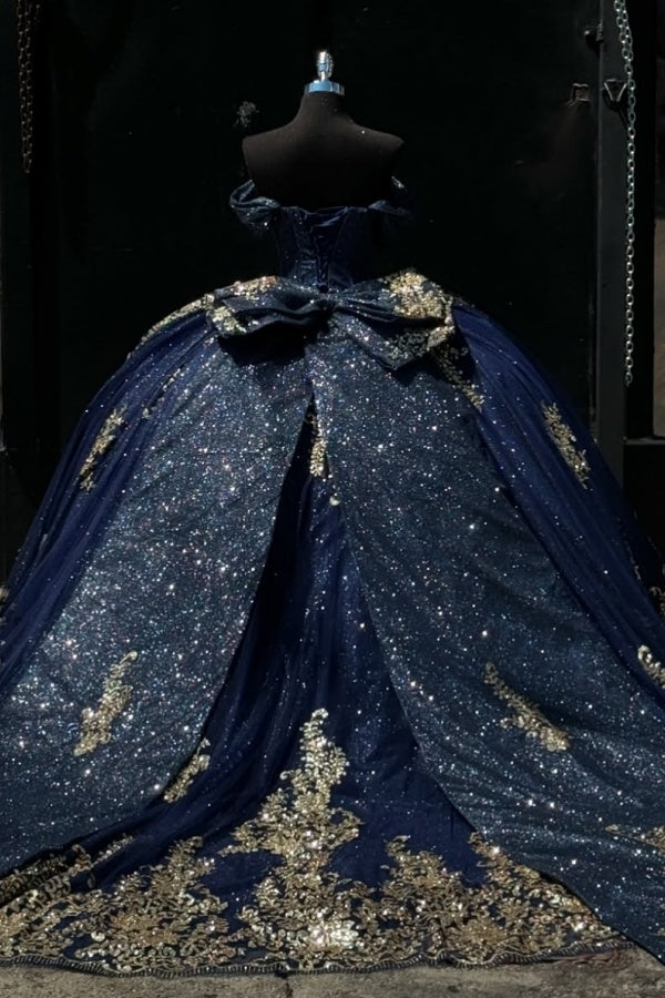 • Merkmale des Quinceanera-Kleides: Langes Ballkleid mit Blumenapplikationen und trägerlosem Korsett, verziert mit metallischen Stickereien und Kristallperlen; der volle Glitzertüllrock wurde passend dazu akzentuiert und verfügt über eine geformte Überlage und eine Kathedralenschleppe.