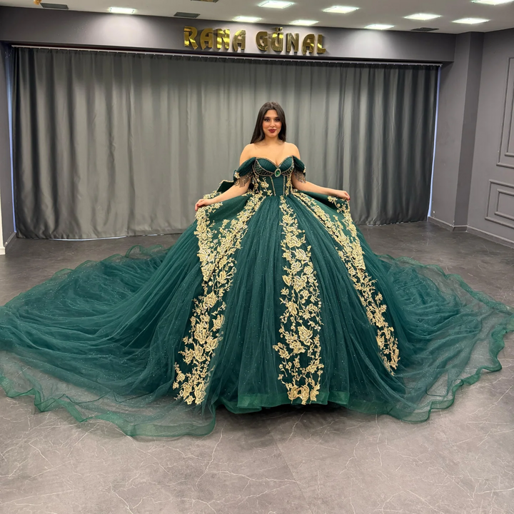 Langes Quinceanera-Kleid mit Herzausschnitt für Damen, trägerloses Korsett mit Blumenapplikationen, Perlenbesetztes Tüll-Ballkleid