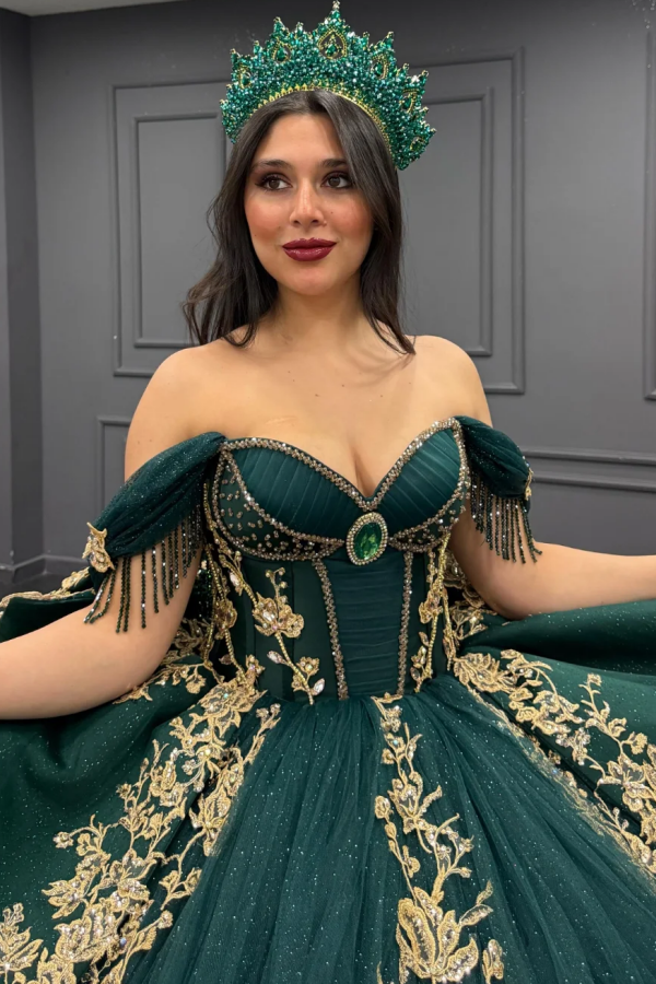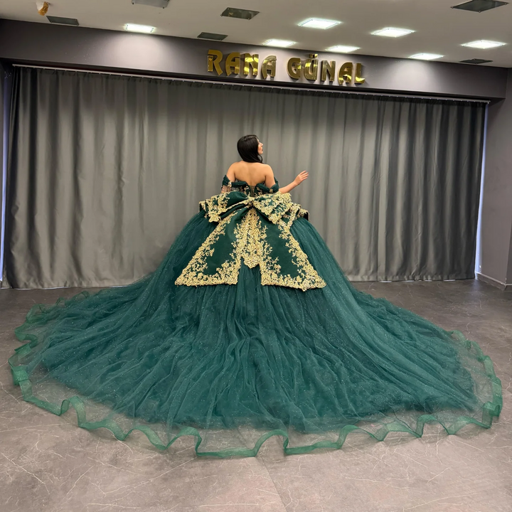 • Merkmale des Quinceanera-Kleides: Langes Ballkleid mit Blumenapplikationen und trägerlosem Korsett, verziert mit metallischen Stickereien und Kristallperlen; der volle Glitzertüllrock wurde passend dazu akzentuiert und verfügt über eine geformte Überlage und eine Kathedralenschleppe.