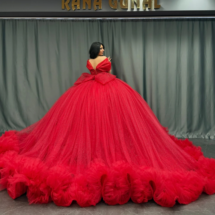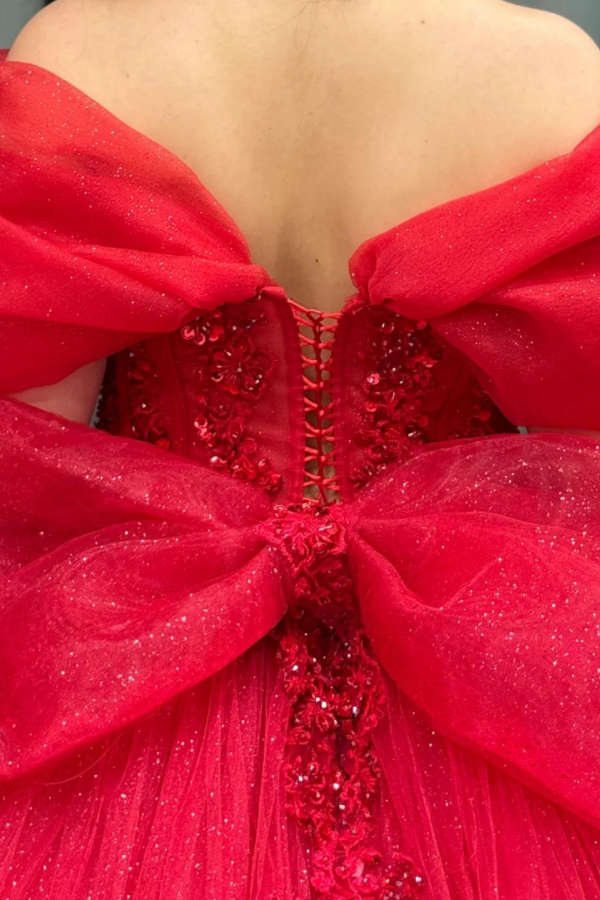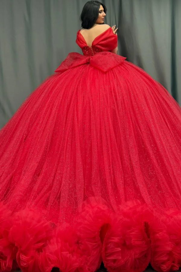 • Merkmale des Quinceanera-Kleides: Langes Ballkleid mit Blumenapplikationen und trägerlosem Korsett, verziert mit metallischen Stickereien und Kristallperlen; der volle Glitzertüllrock wurde passend dazu akzentuiert und verfügt über eine geformte Überlage und eine Kathedralenschleppe.