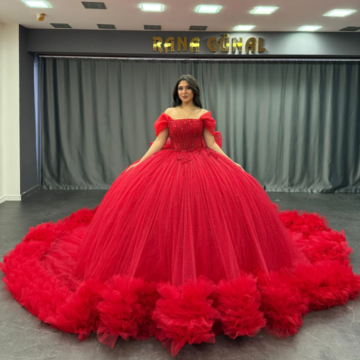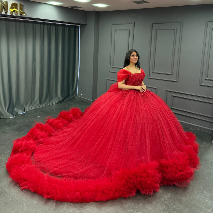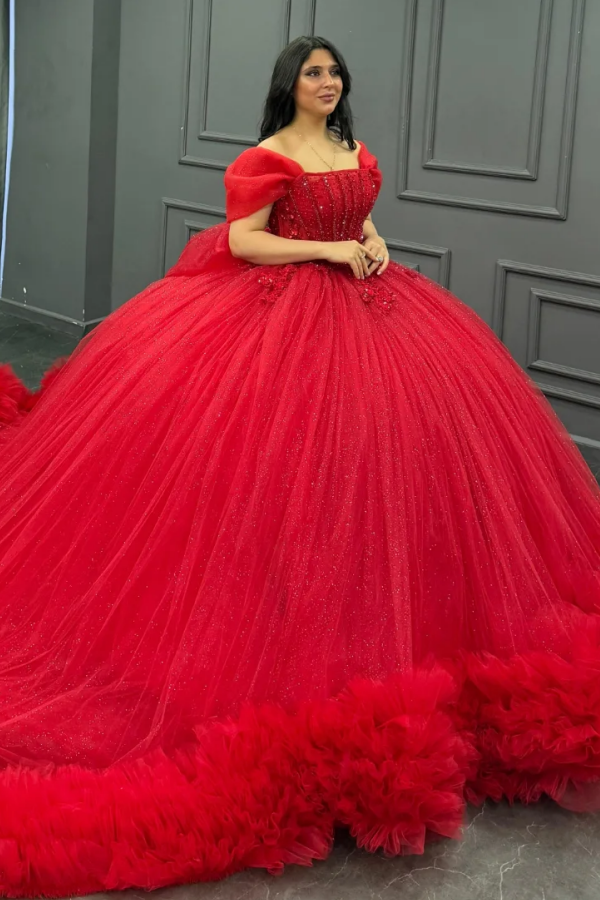 Langes Quinceanera-Kleid mit Herzausschnitt für Damen, trägerloses Korsett mit Blumenapplikationen, Perlenbesetztes Tüll-Ballkleid
