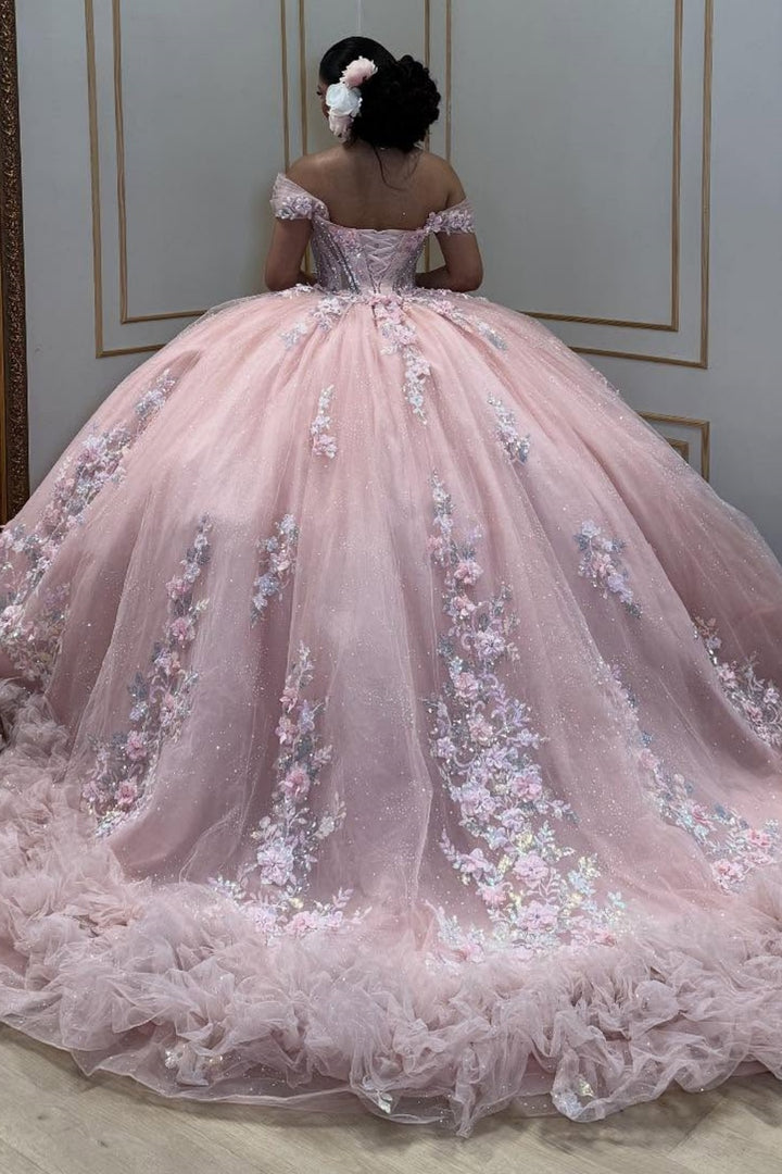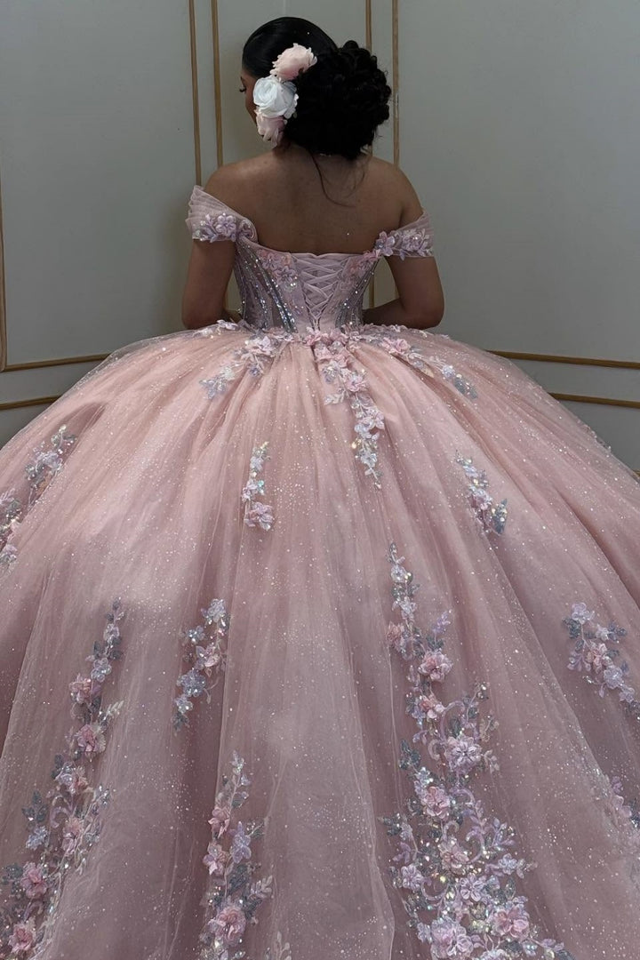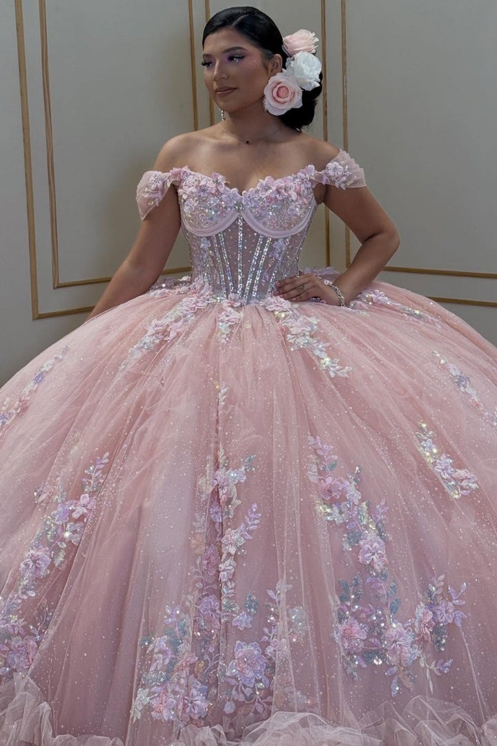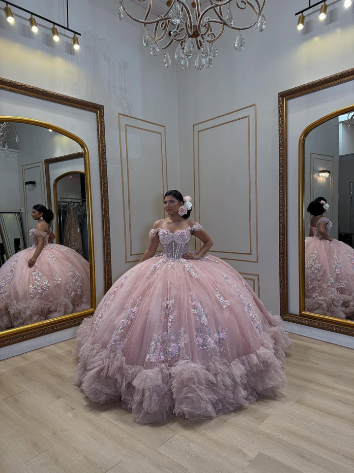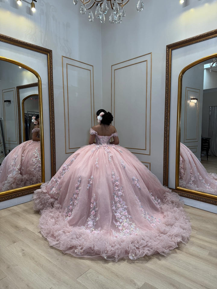 Description: This off-shoulder, sleeveless quinceañera dress in soft pink is adorned with shimmering sequins and delicate 3D flower appliques. Its elegant design accentuates the neckline and shoulders while offering sophisticated detailing for a standout Sweet 15 celebration. Crafted to combine beauty and comfort, this dress ensures you will make a graceful impression on your special day.