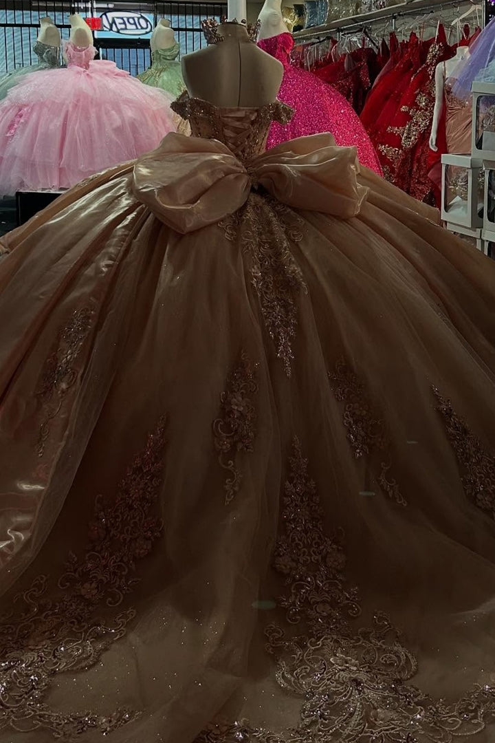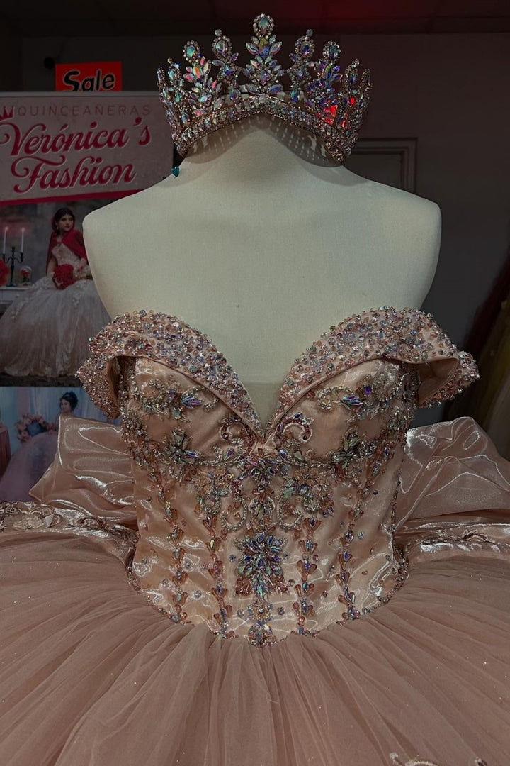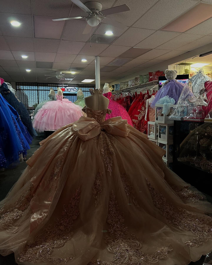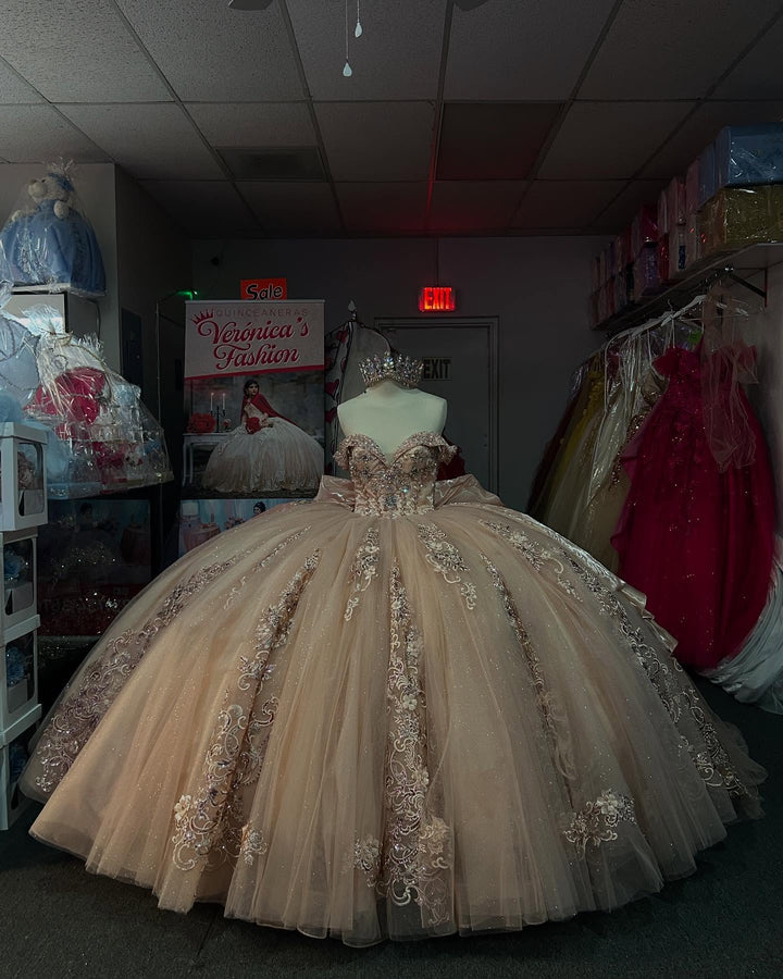 • Merkmale des Quinceanera-Kleides: Langes Ballkleid mit Blumenapplikationen und trägerlosem Korsett, verziert mit metallischen Stickereien und Kristallperlen; der volle Glitzertüllrock wurde passend dazu akzentuiert und verfügt über eine geformte Überlage und eine Kathedralenschleppe.