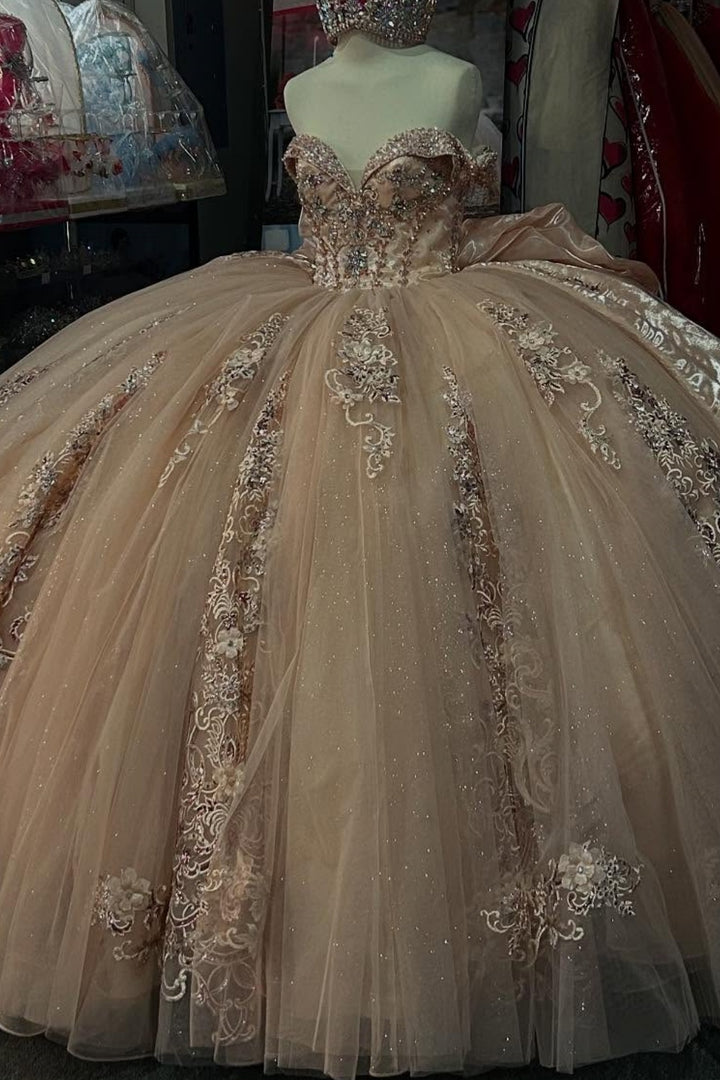 Langes Quinceanera-Kleid mit Herzausschnitt für Damen, trägerloses Korsett mit Blumenapplikationen, Perlenbesetztes Tüll-Ballkleid